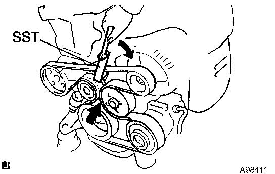 a) Slowly turn the belt tensioner clockwise for more than 3 seconds, and remove the drive belt by using SST.