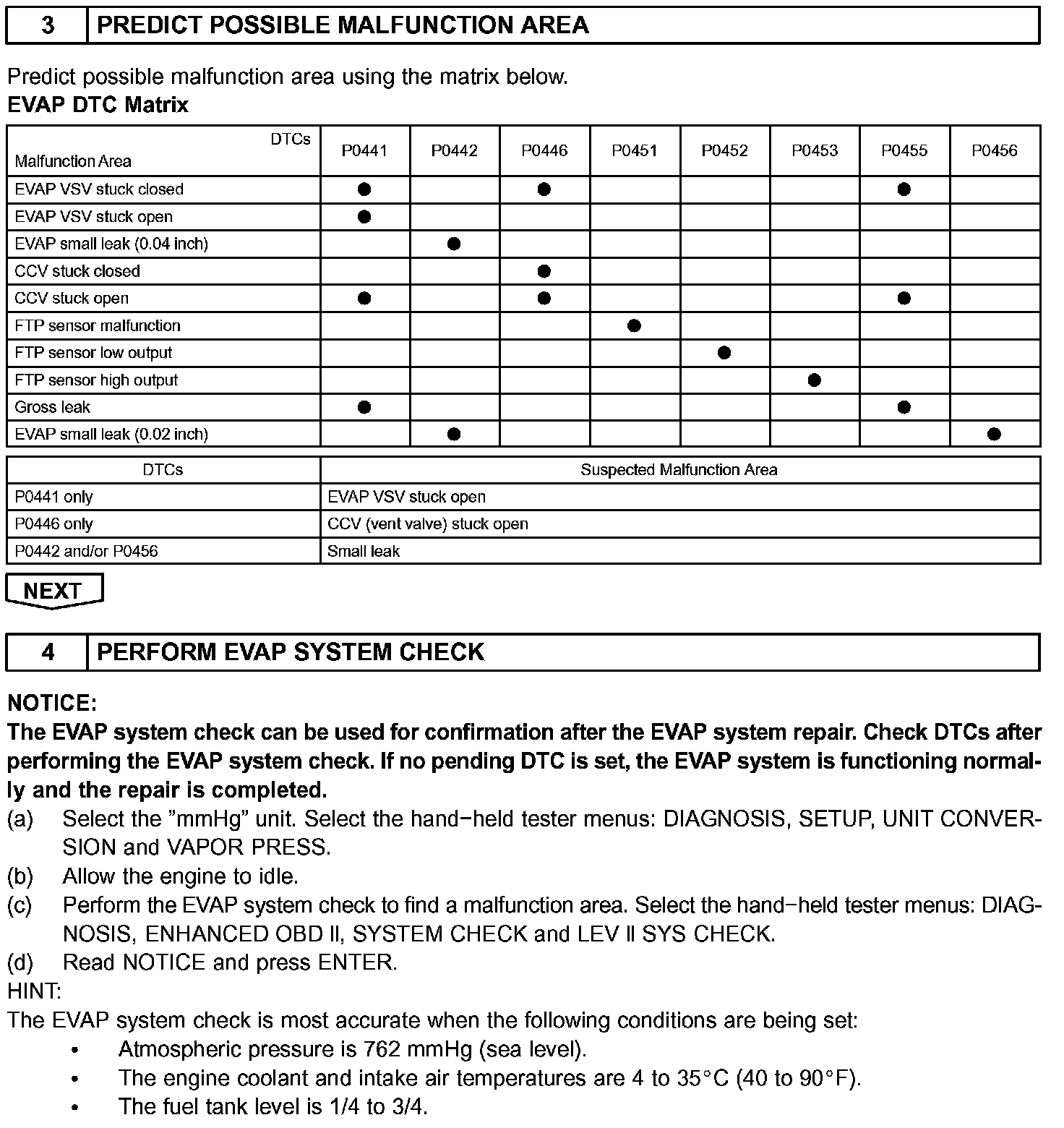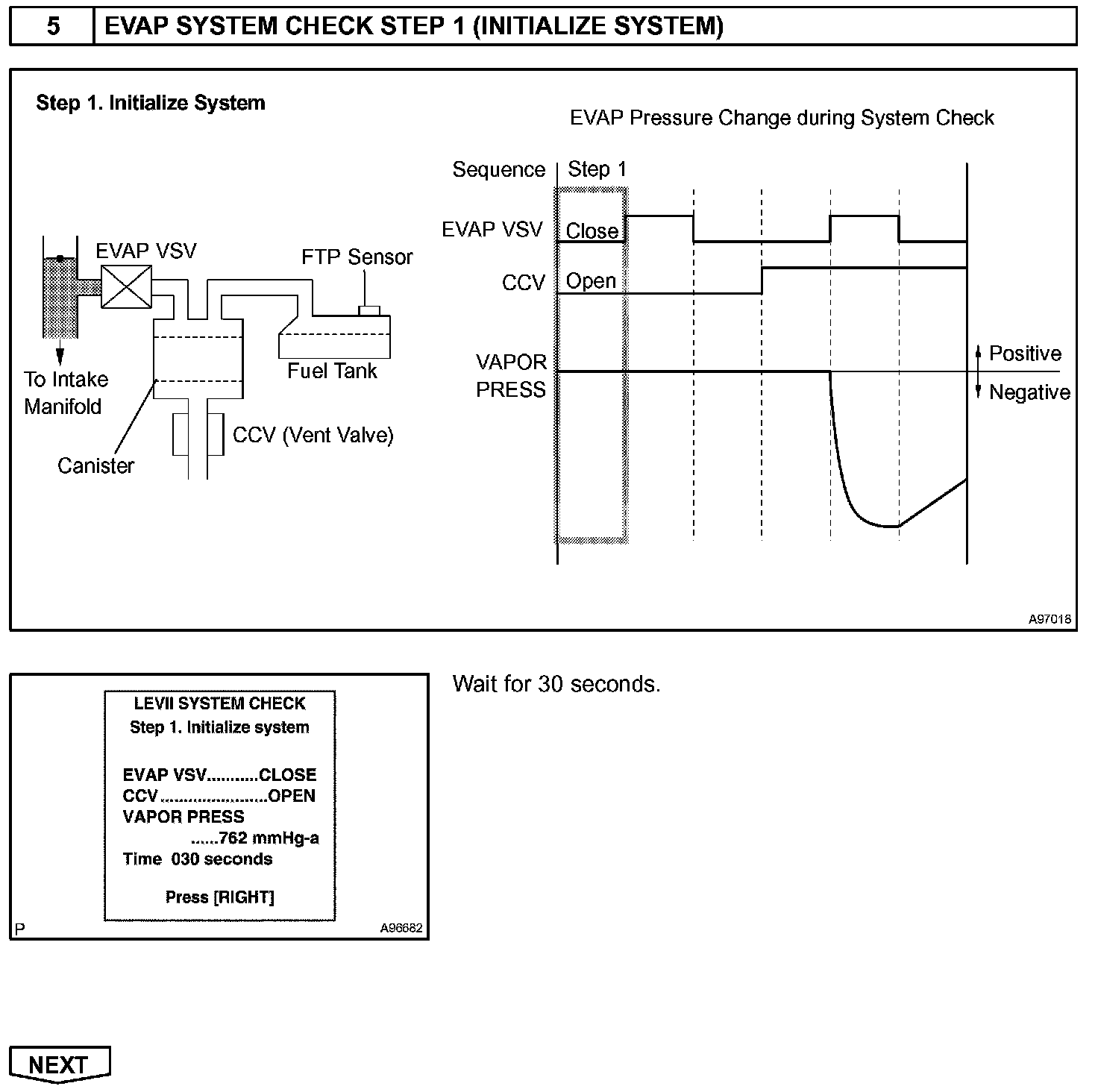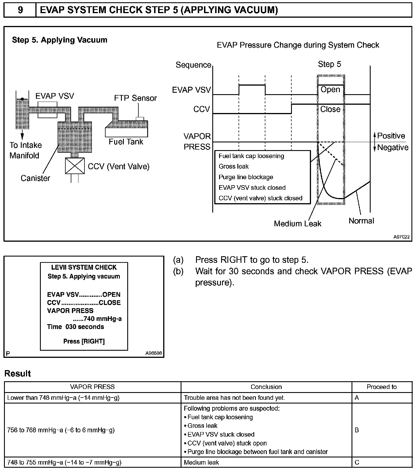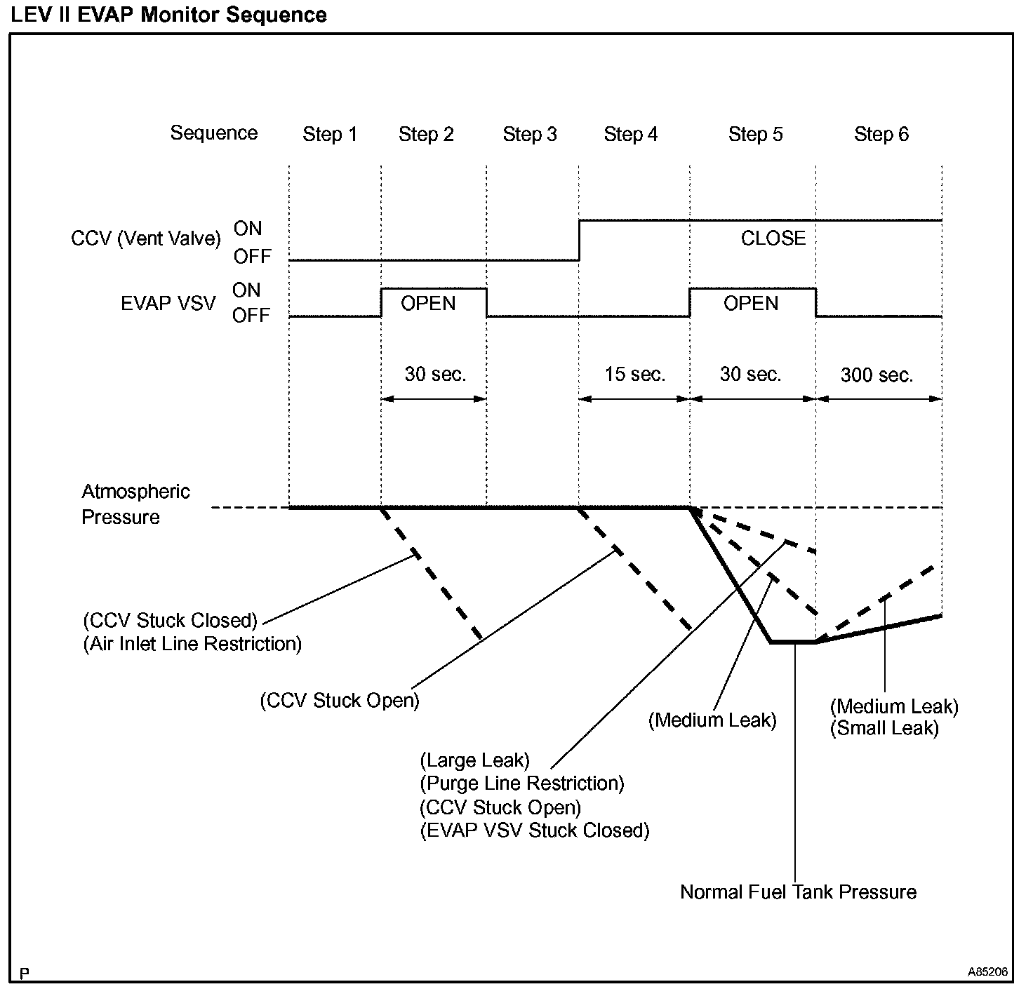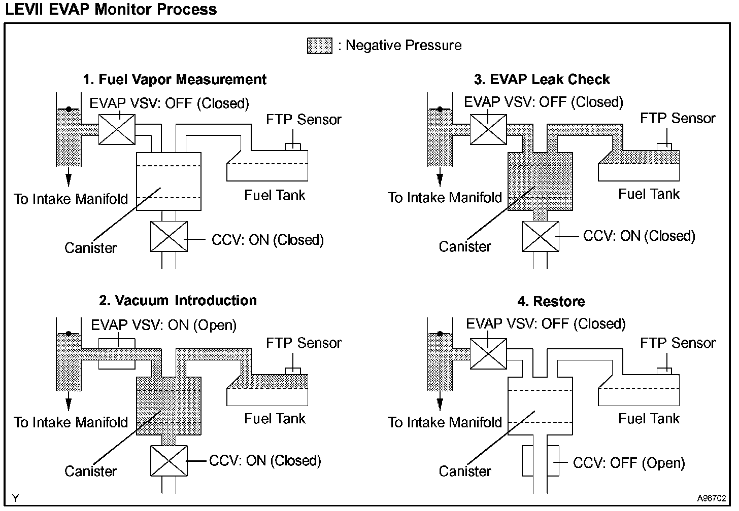 The EVAP monitor's purpose is to check for EVAP leaks and EVAP VSV and CCV malfunctions. The monitor performs the check by first introducing the intake manifold's negative pressure (vacuum) to the EVAP system. Then, the monitor records change in the EVAP system's pressure levels. The monitor runs when the following conditions are met: