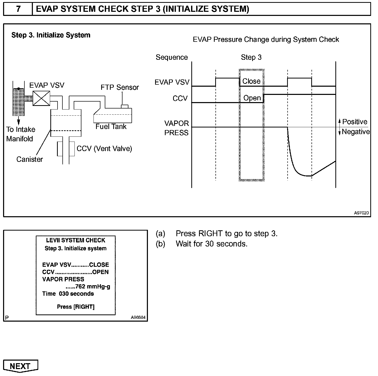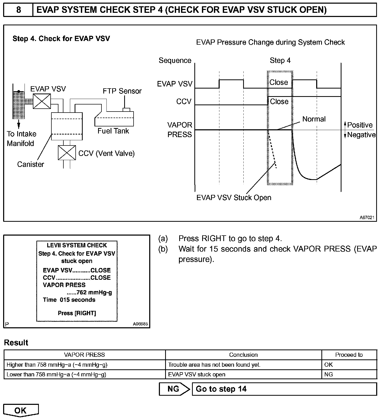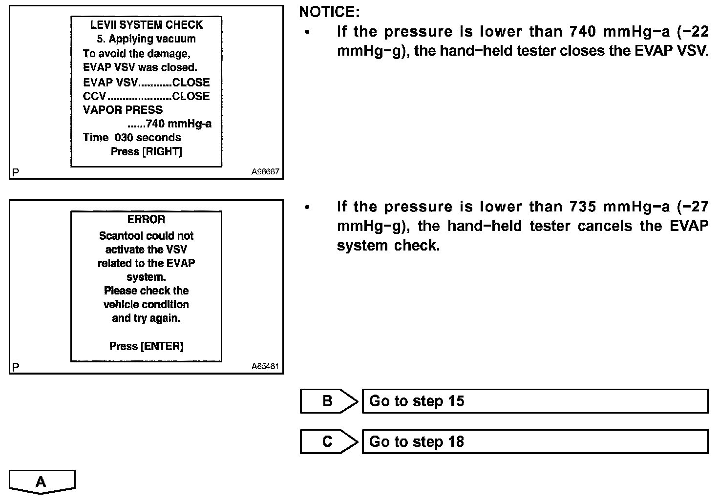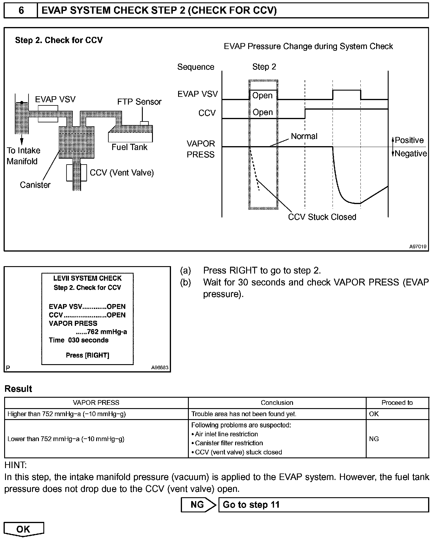 The EVAP monitor's purpose is to check for EVAP leaks and EVAP VSV and CCV malfunctions. The monitor performs the check by first introducing the intake manifold's negative pressure (vacuum) to the EVAP system. Then, the monitor records change in the EVAP system's pressure levels. The monitor runs when the following conditions are met: