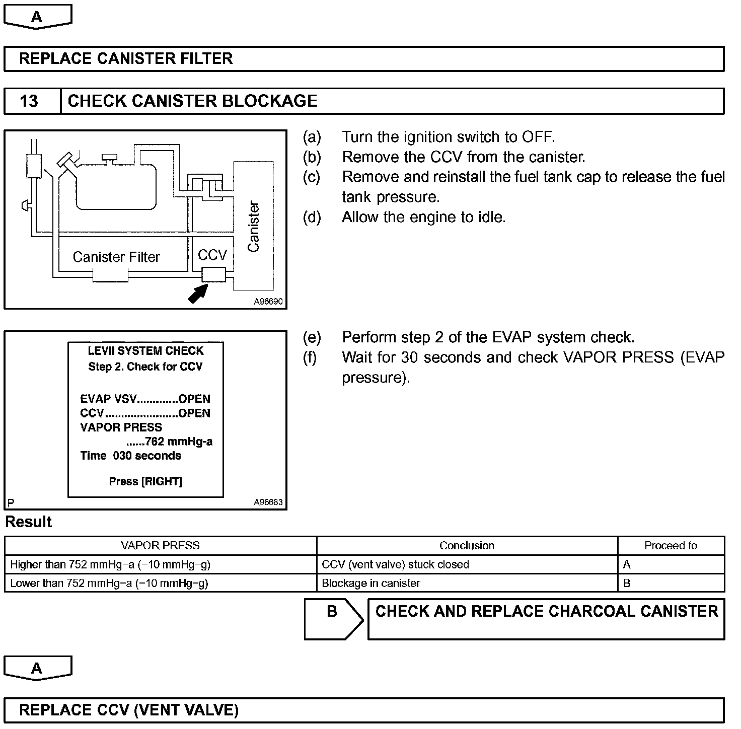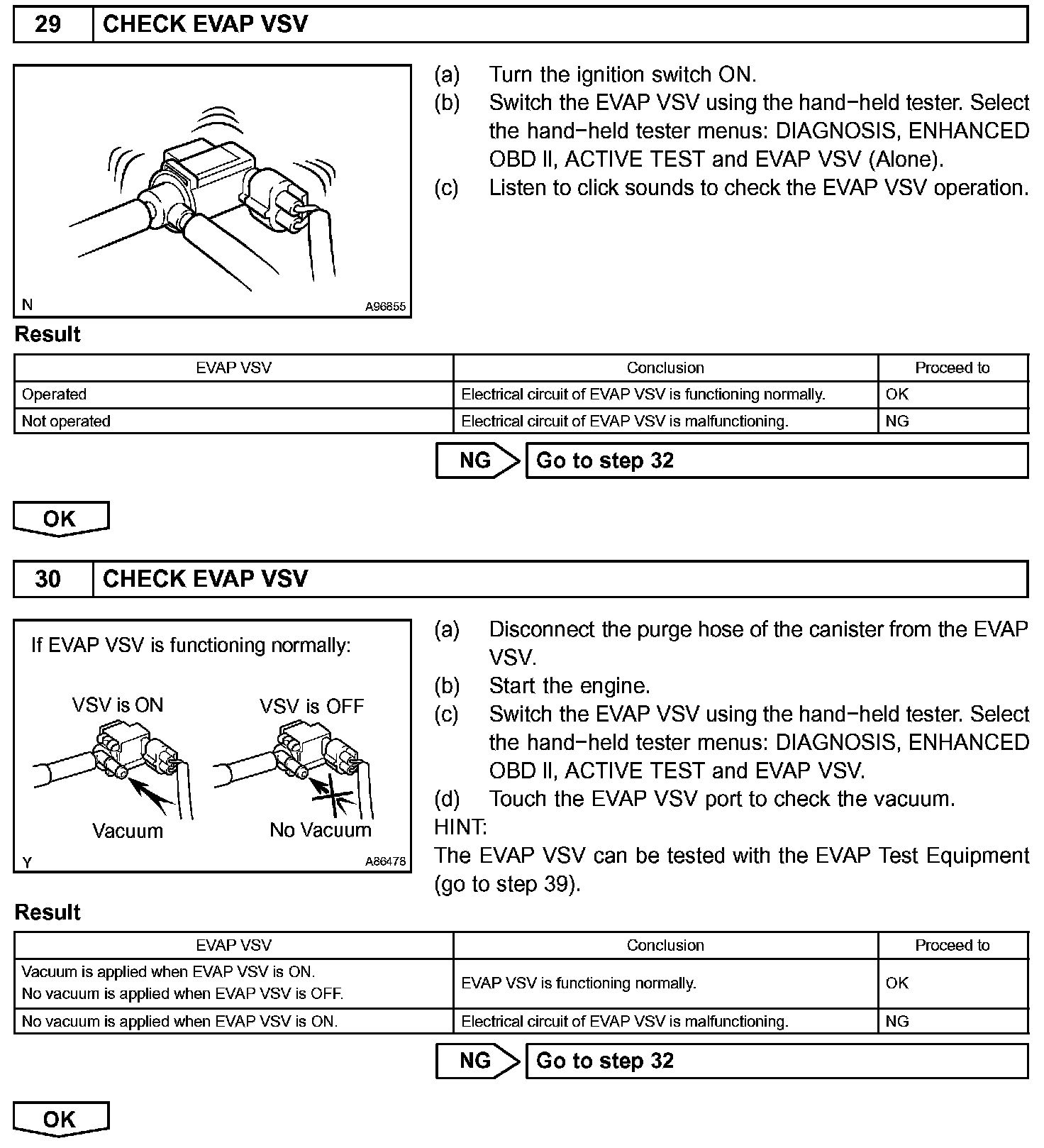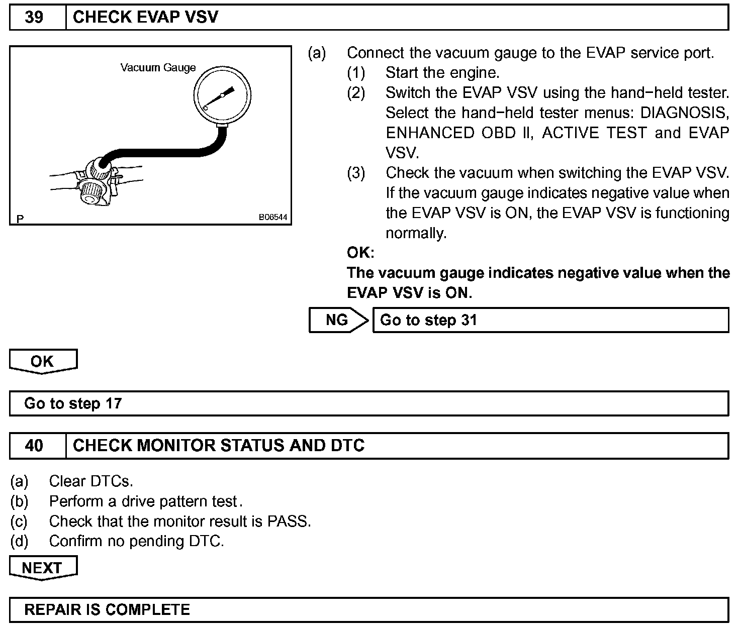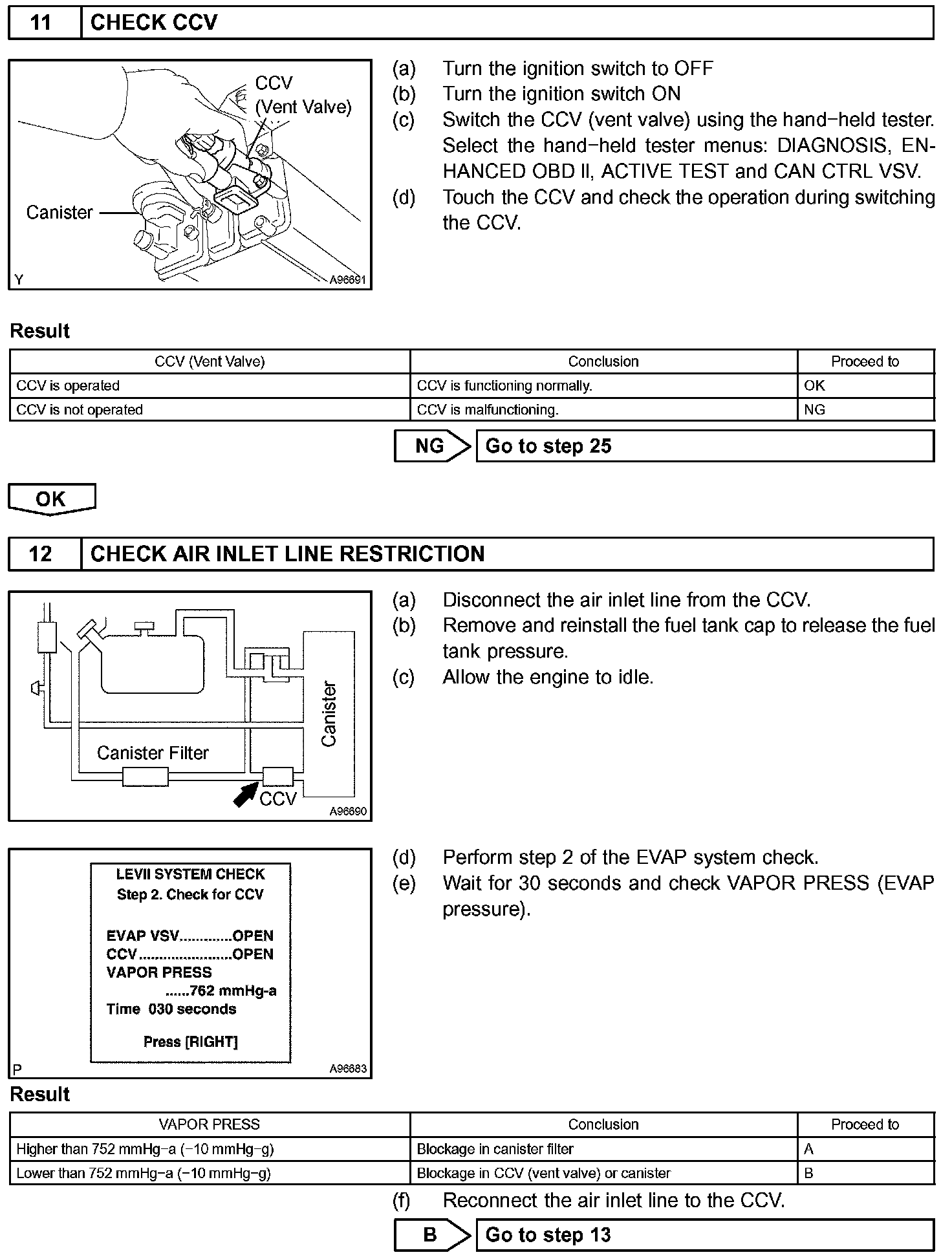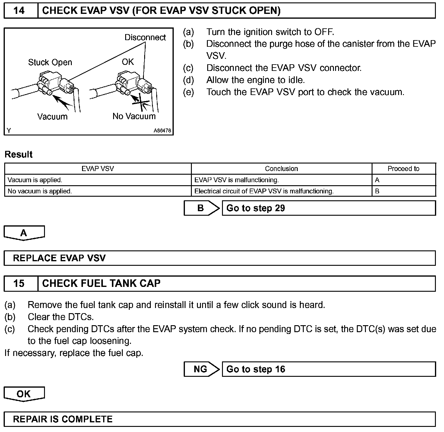 The EVAP monitor's purpose is to check for EVAP leaks and EVAP VSV and CCV malfunctions. The monitor performs the check by first introducing the intake manifold's negative pressure (vacuum) to the EVAP system. Then, the monitor records change in the EVAP system's pressure levels. The monitor runs when the following conditions are met:
