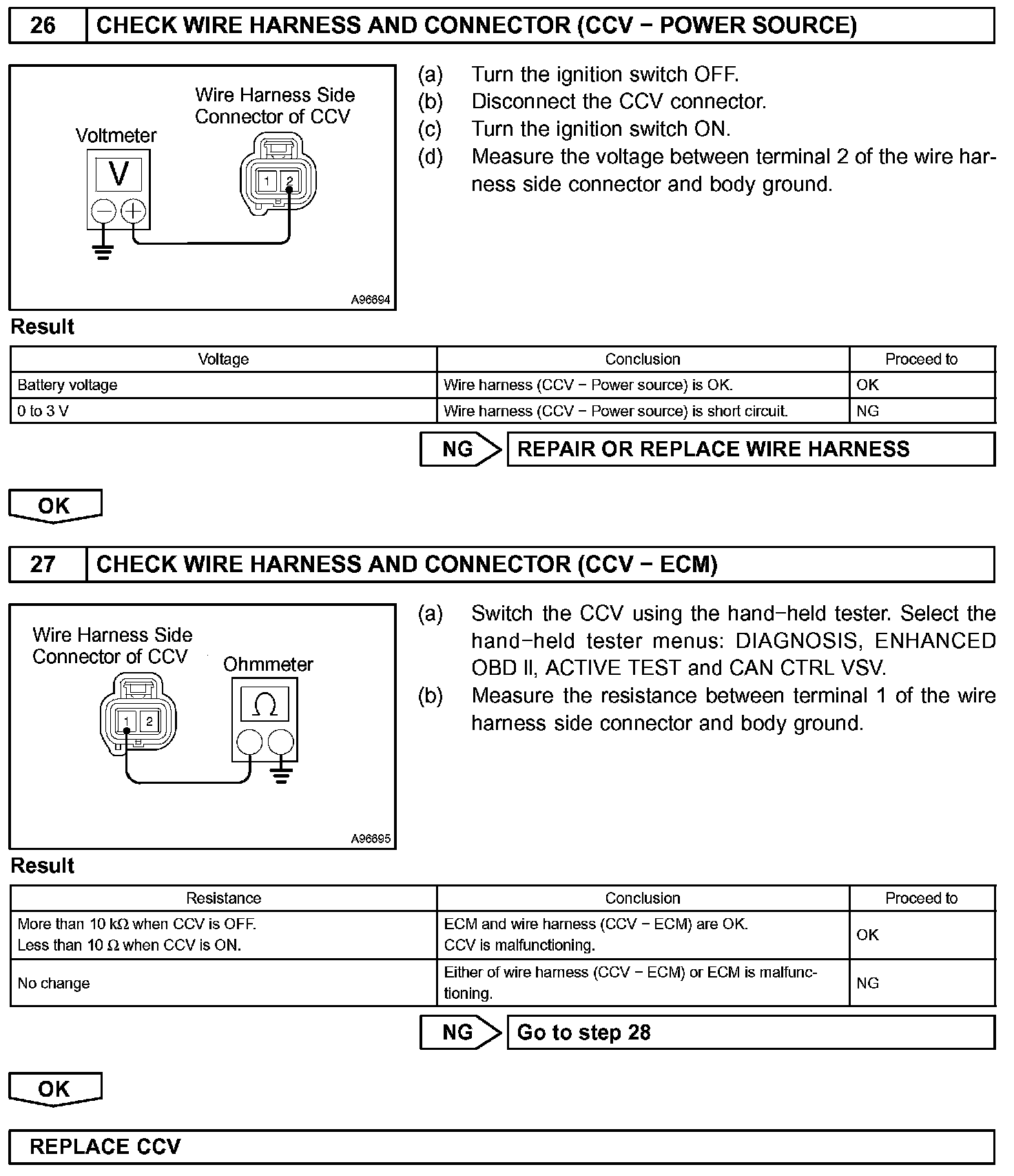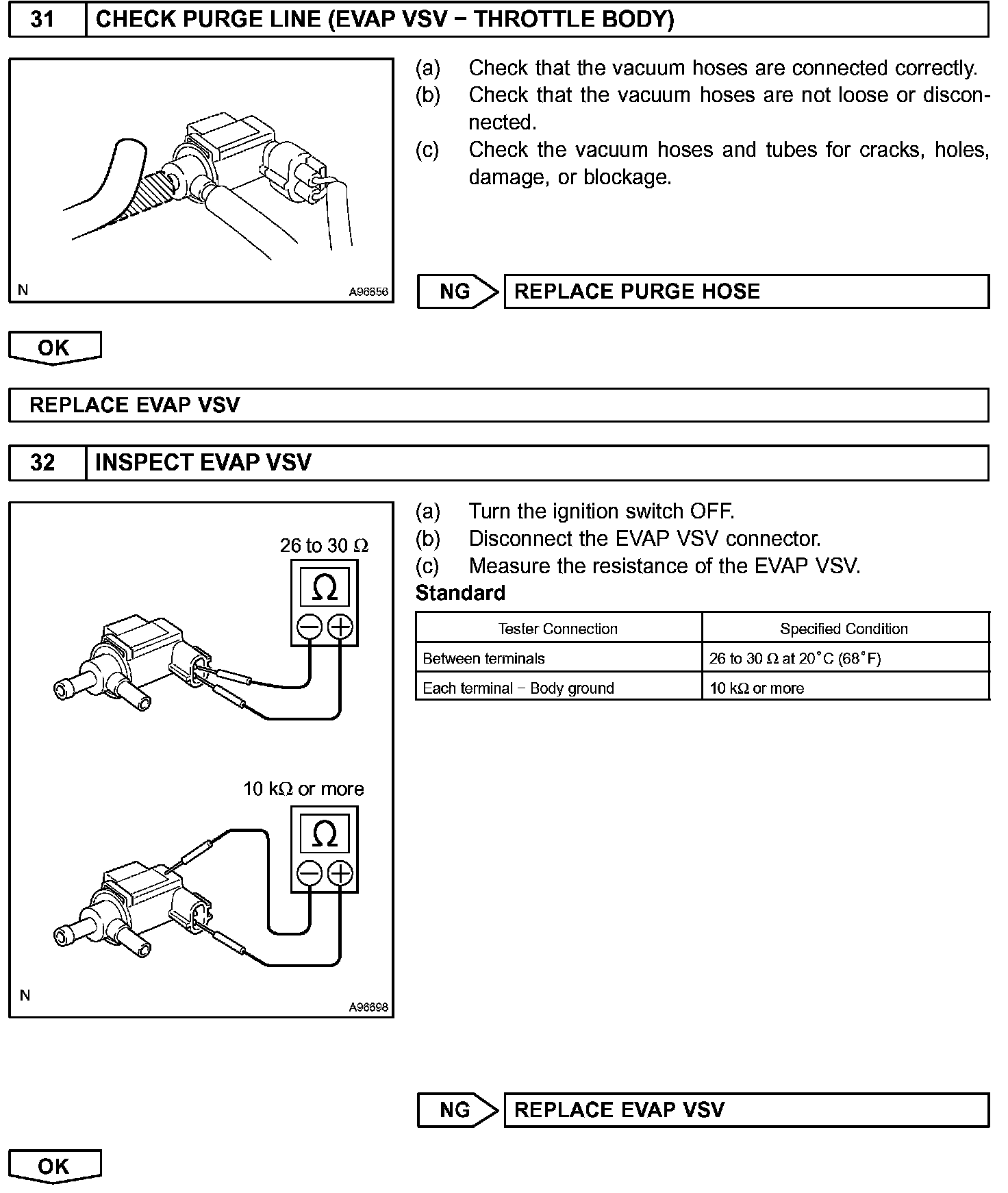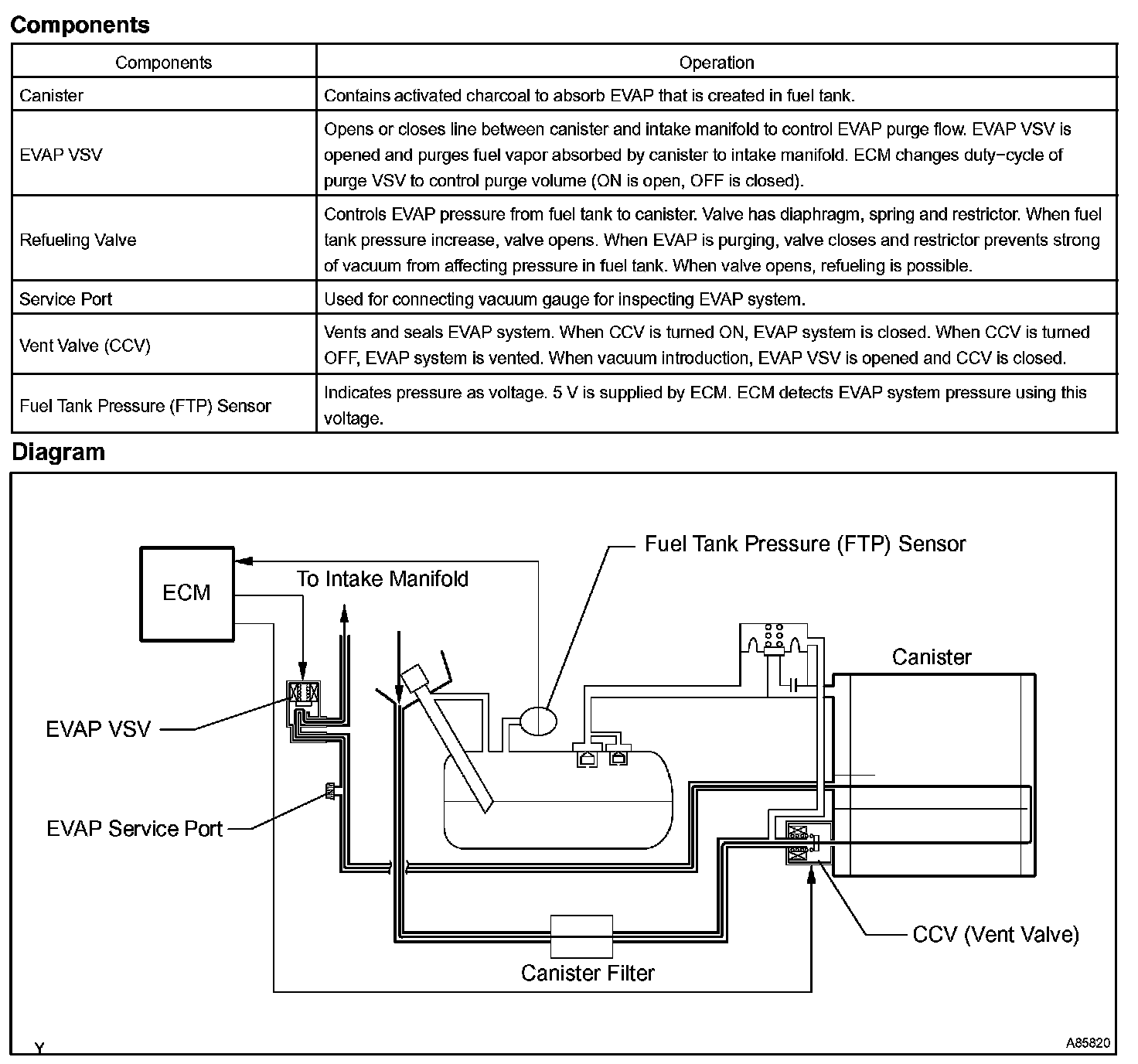 When predetermined conditions (closed loop, etc.) are met, the EVAP VSV is opened and stored fuel vapor in the canister is purged to the intake manifold. The ECM changes duty-cycle to the EVAP VSV to control purge flow volume. Purge flow volume is determined by the intake manifold pressure. Atmospheric pressure is allowed into the canister through the vent valve (CCV) to ensure that purge flow is maintained when negative pressure (vacuum) is applied to the canister. This EVAP system contains given components.