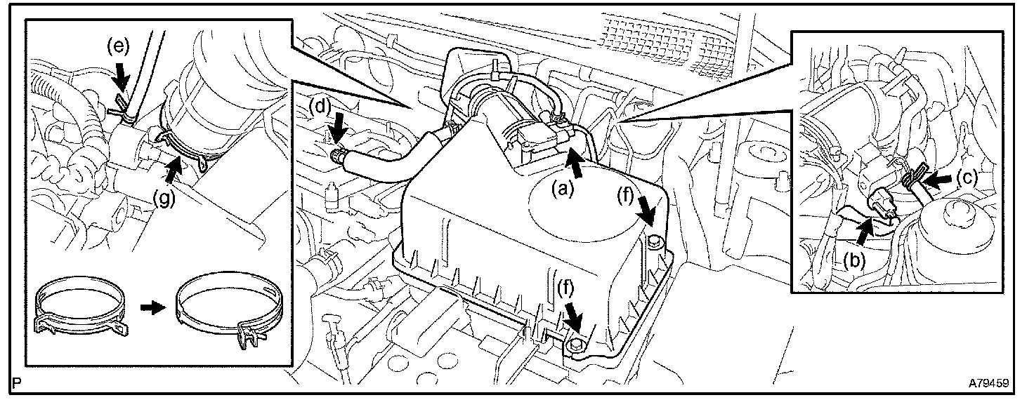 g. Lock the air cleaner hose clamp and remove the air cleaner cap together with the air cleaner hose.