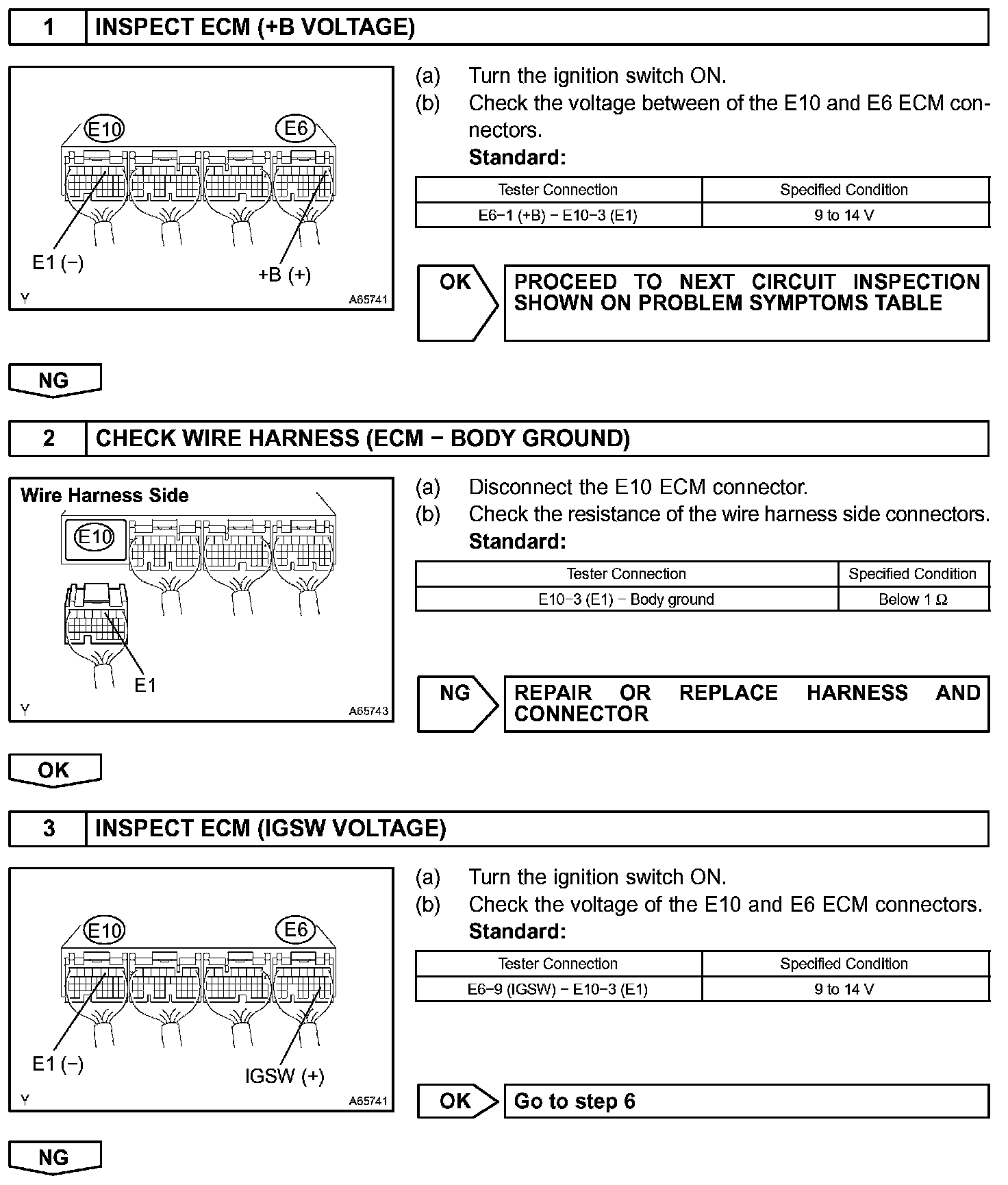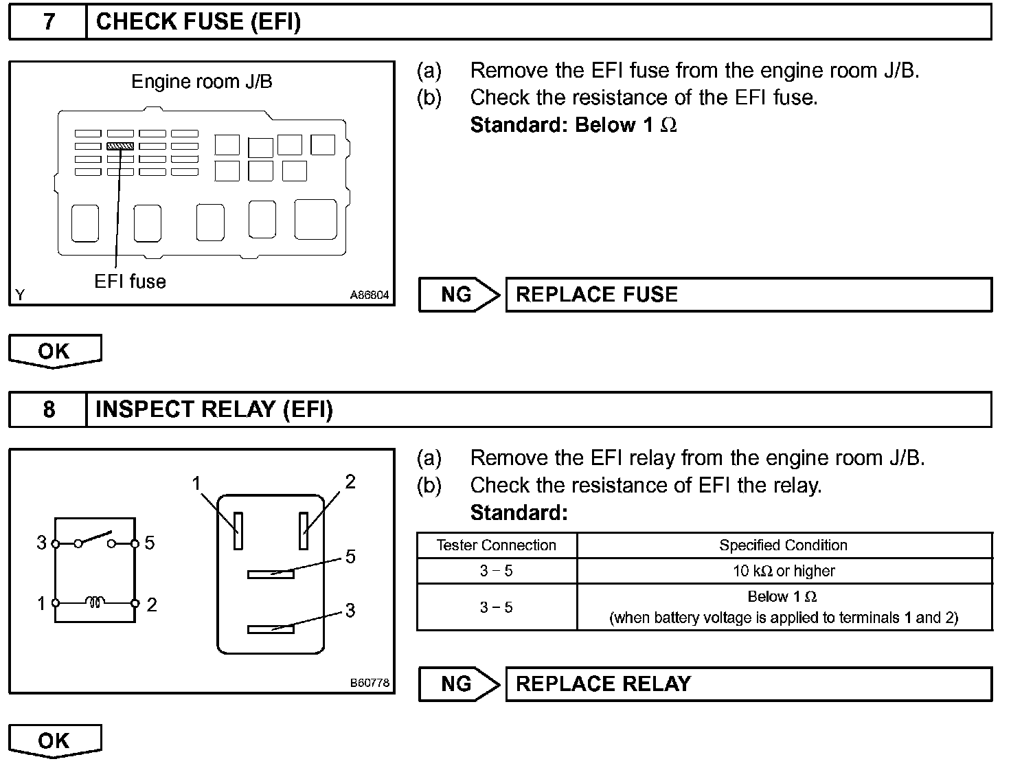 When the ignition switch is turned ON, battery voltage is applied to terminal IGSW of the ECM. The ECM "MREL" output signal causes current to flow to the coil, closing the contacts of the EFI relay (Marked: EFI) and supplying power to terminal +B of the ECM.