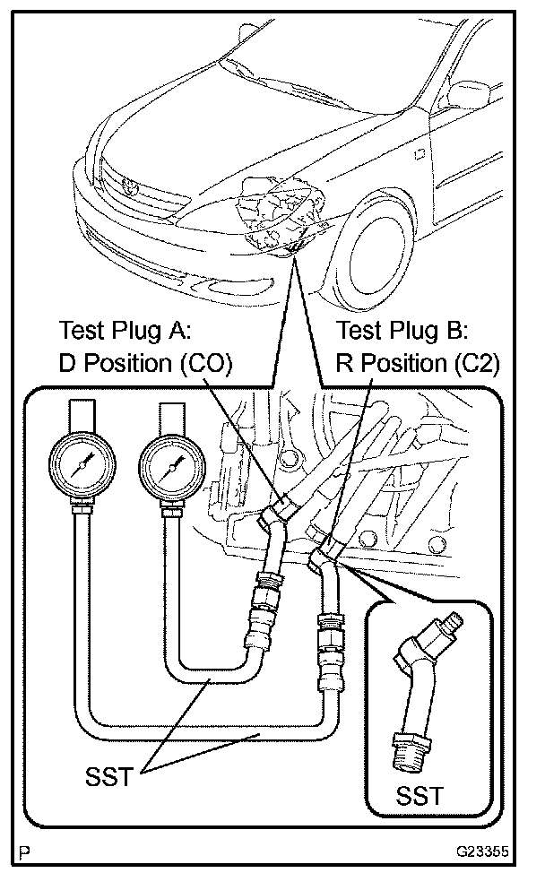 5. Remove the test plug A on the transaxle case front left side and install the SST.