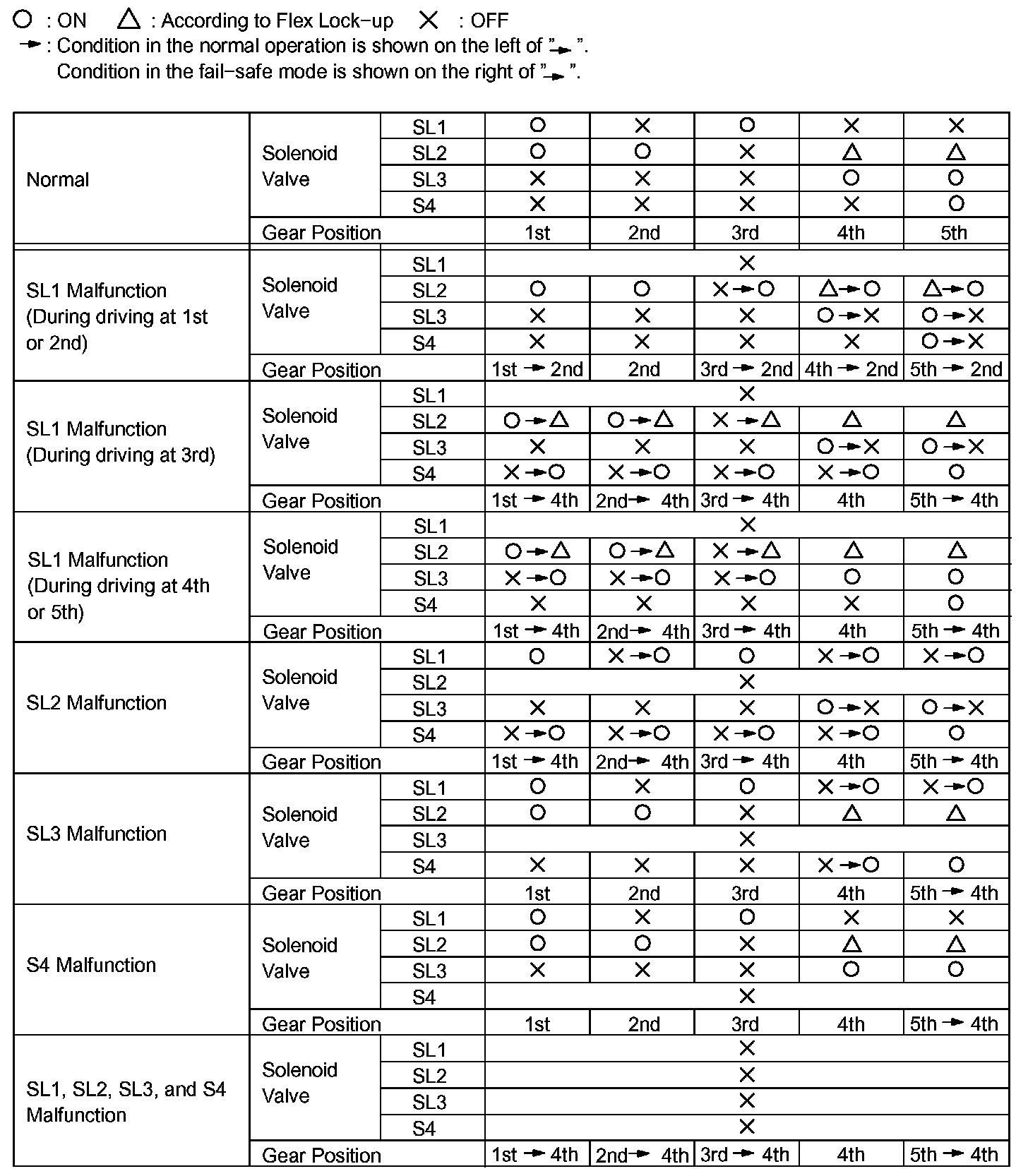 If either of the shift solenoid valve circuits develops an open or short, the ECM turns the other shift solenoid "ON" and "OFF" in order to shift into the gear positions shown in the table.