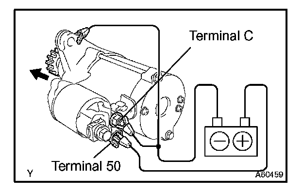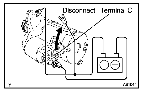 1. Maintain the battery connections in step (a), but disconnect the negative (-) lead from terminal C. Check that the pinion gear remains extended.