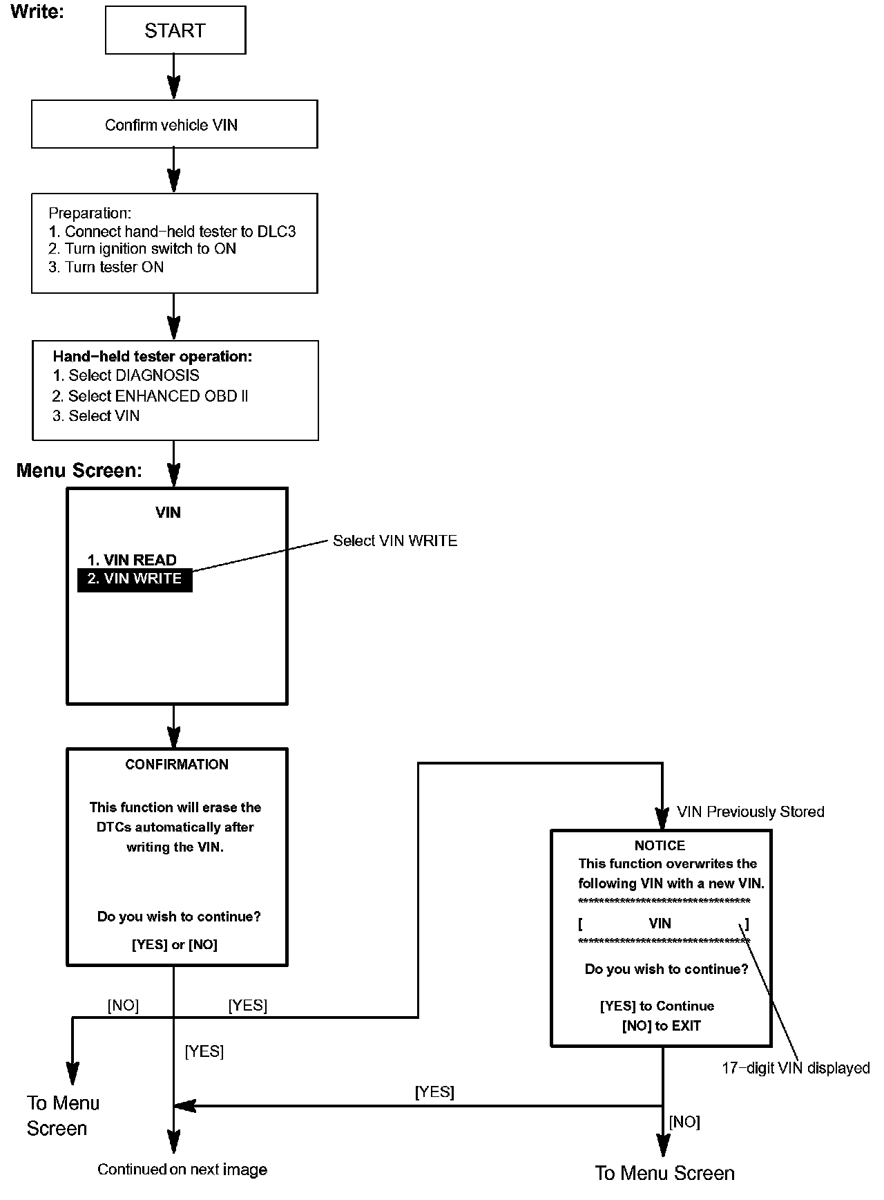 c. Write VIN: Explains the VIN writing process in a flowchart. This process allows the VIN to be input into the ECM. If the ECM is changed, or the VIN and VIN do not match, the VIN can be registered, or overwritten in the ECM by following this procedure.