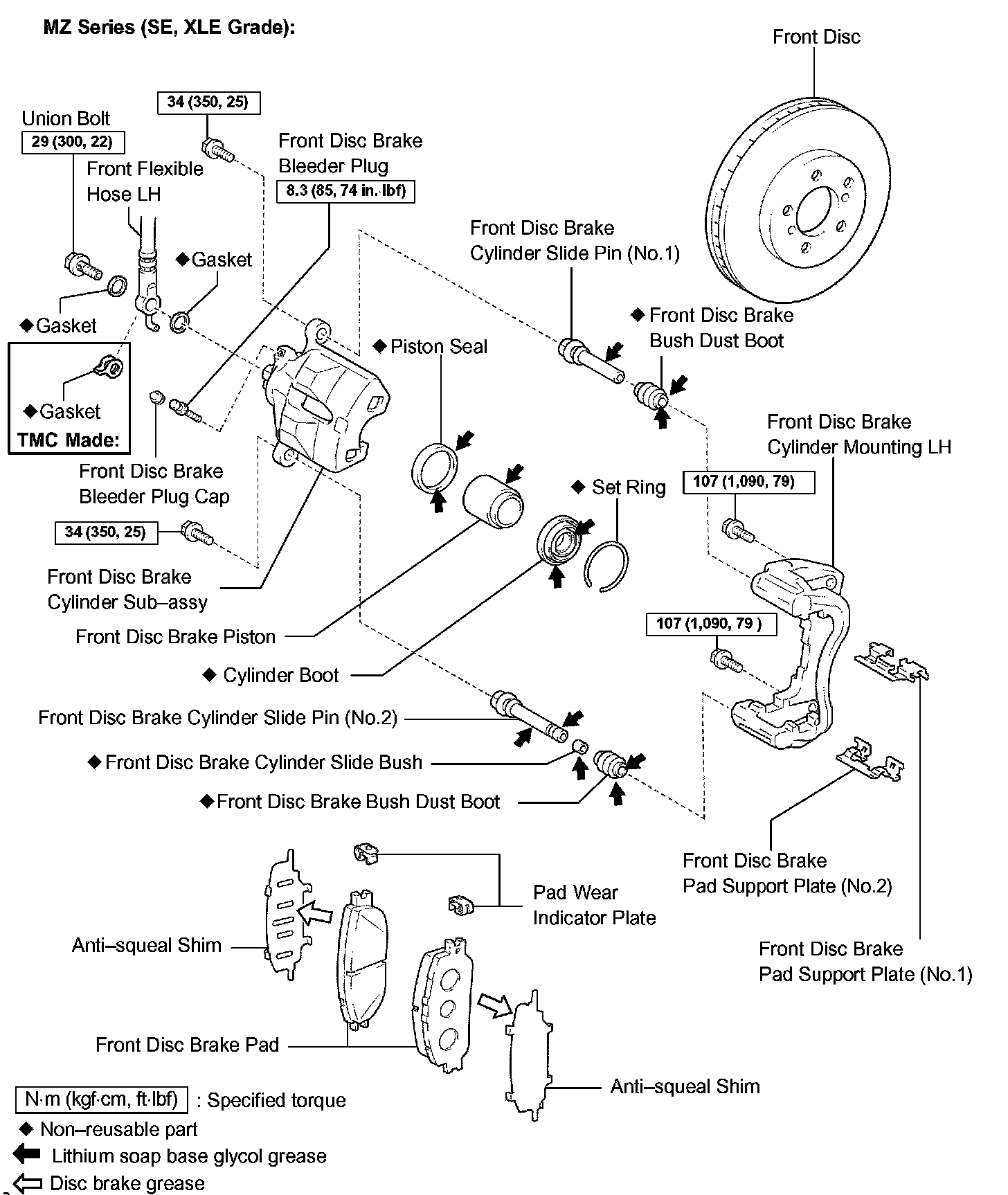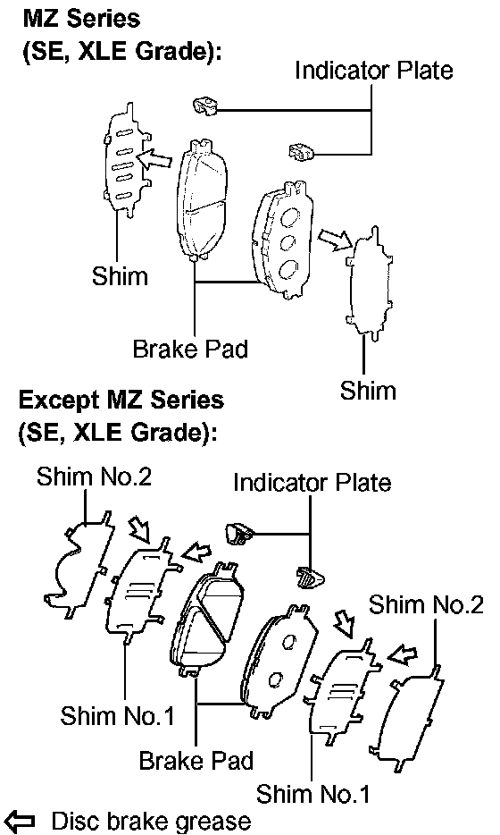 a. MZ Series (SE, XLE Grade): Remove the 2 anti-squeal shims from each pad.