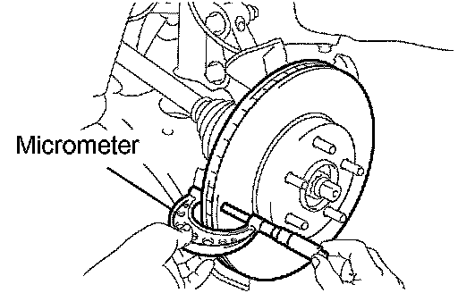 If the runout exceeds the maximum value, change the installation positions of the disc and axle so that the runout will become minimal. If the runout exceeds the maximum even when the installation positions are changed, grind the disc. If the disc thickness is less than the minimum, replace the front disc.