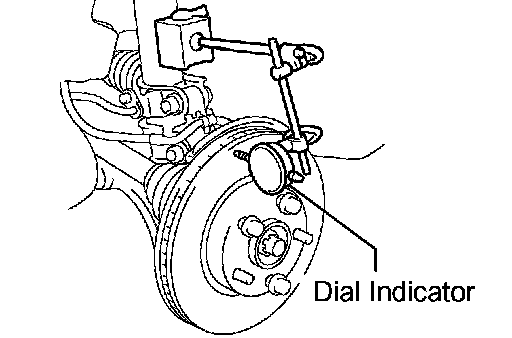 c. Using a dial indicator, measure the disc runout 10 mm (0.39 inch) away from the outer edge of the front disc.