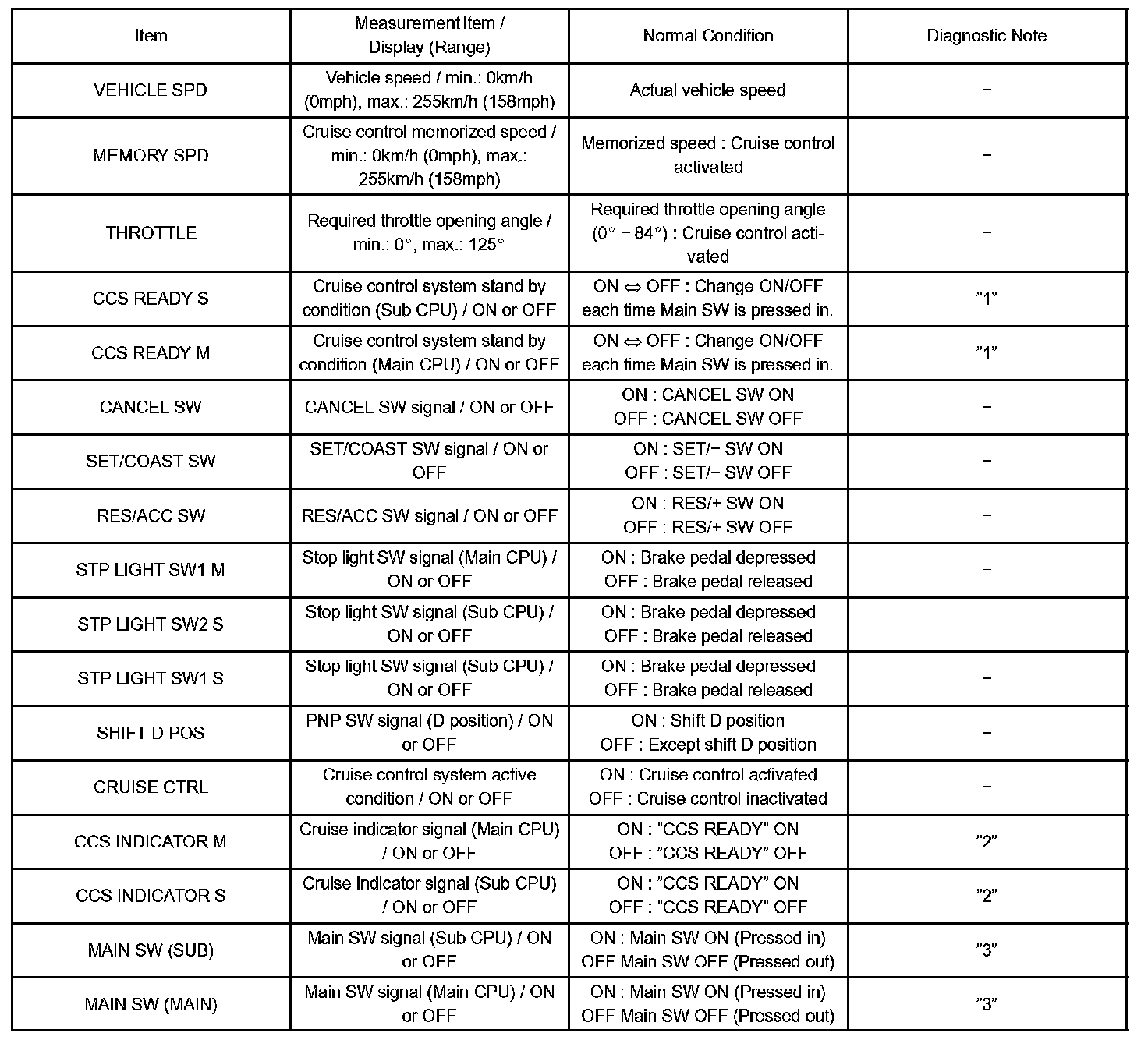 "3" is OK but cruise indicator does not turn on ->Indicator or W/H or ECM failure