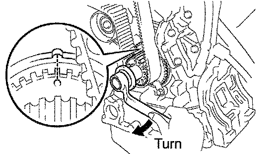2. Turn the crankshaft clockwise, and align the timing mark of the crankshaft timing pulley with the oil pump body,