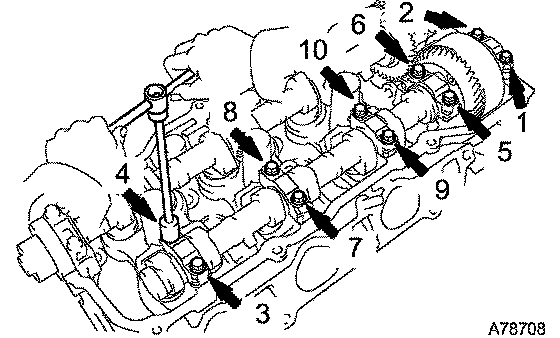 c. Uniformly loosen and remove the 10 bearing cap bolts in the sequence shown in the illustration. Remove the 5 bearing caps and the camshaft.