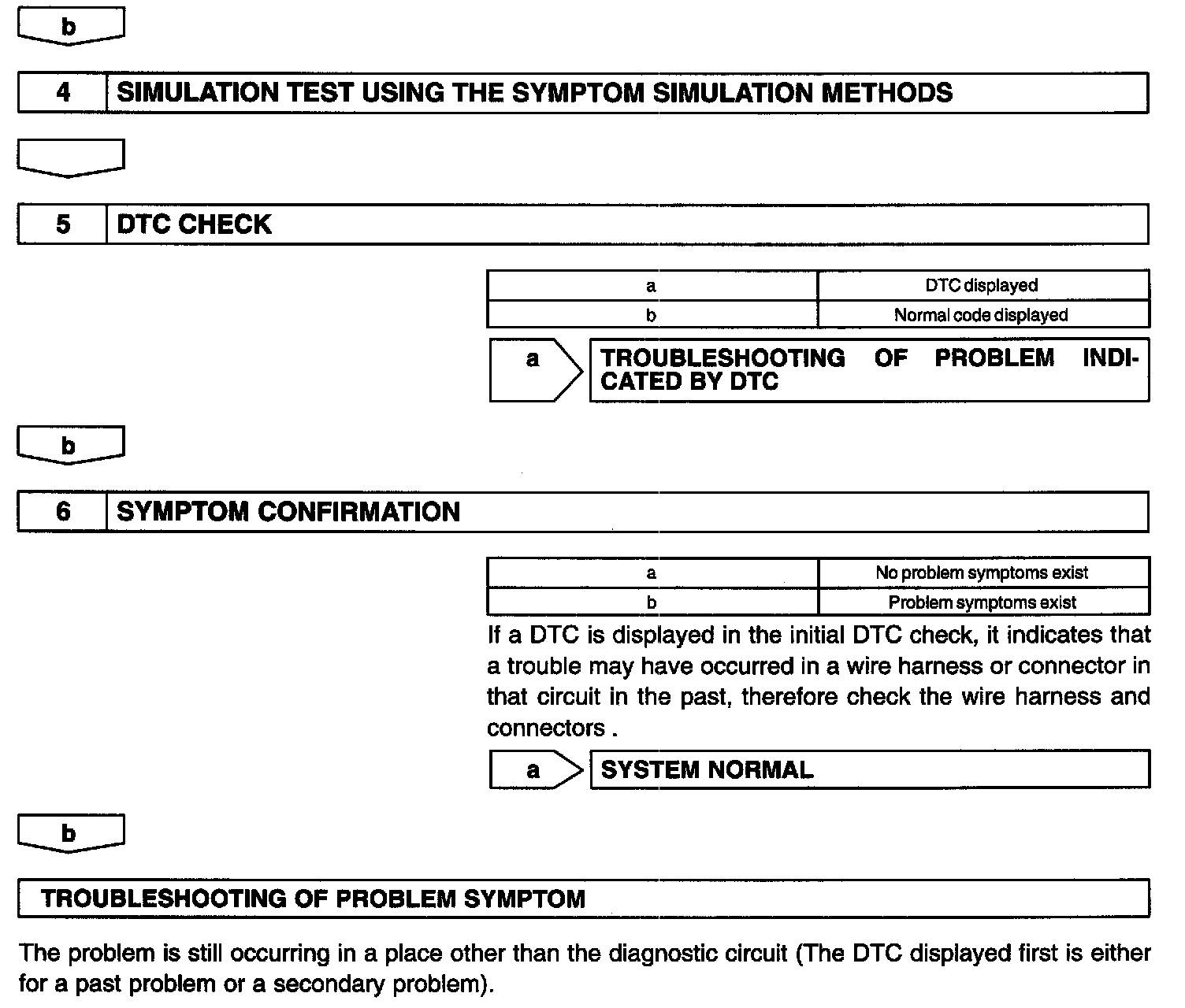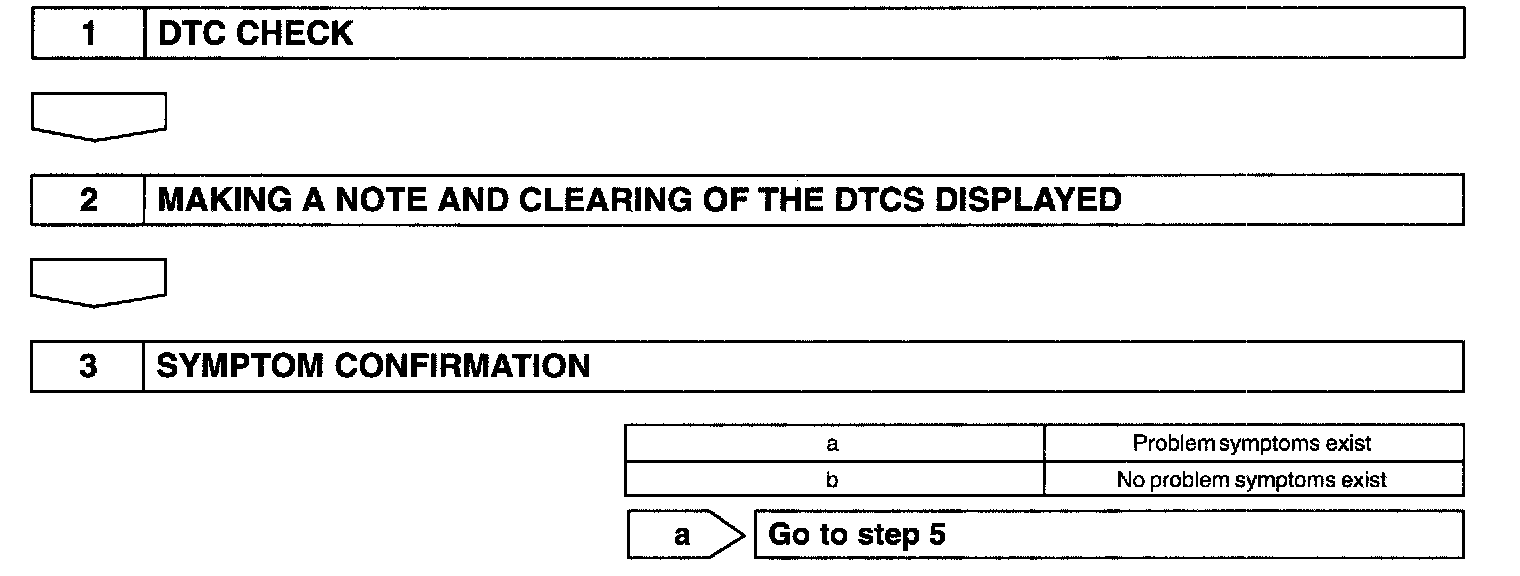 - A flow chart showing how to proceed with the troubleshooting using the diagnostic trouble code (DTC) check is shown. This flow chart shows how to utilize the DTC check effectively. Then, by carefully checking the results, this chart indicates how to proceed either to the DTC troubleshooting or to the troubleshooting of the problem symptoms table.