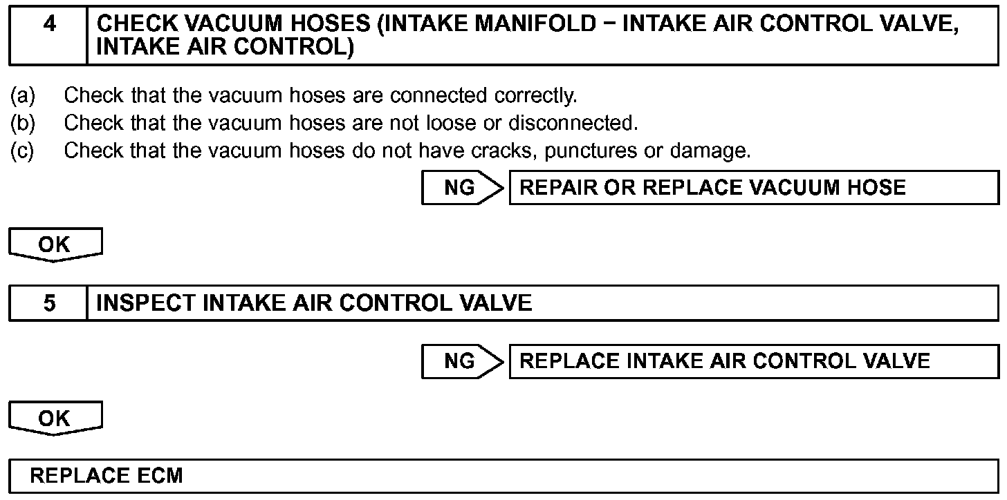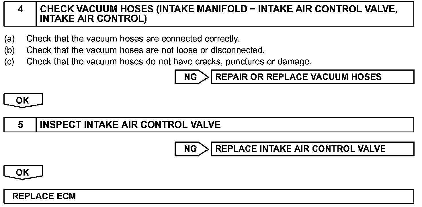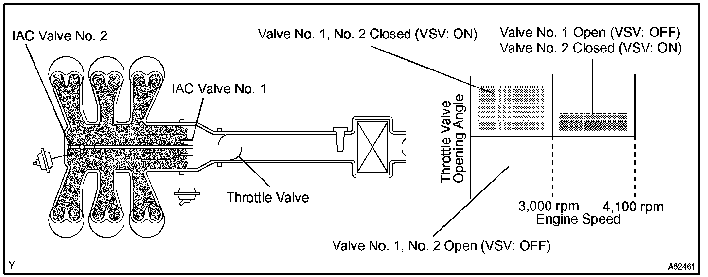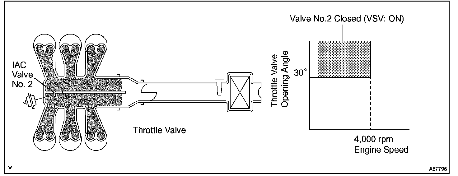 The ECM opens and closes the Intake Air Control (IAC) valve No. 2 in response to engine speed (RPM/NE). This system improves intake manifold tuning for better efficiency at low and high engine rpm. When the engine speed is 4,000 rpm or less and the throttle valve opening angle is 30 degrees or more, the ECM turns the VSV On or Off to operate the IAC valve.