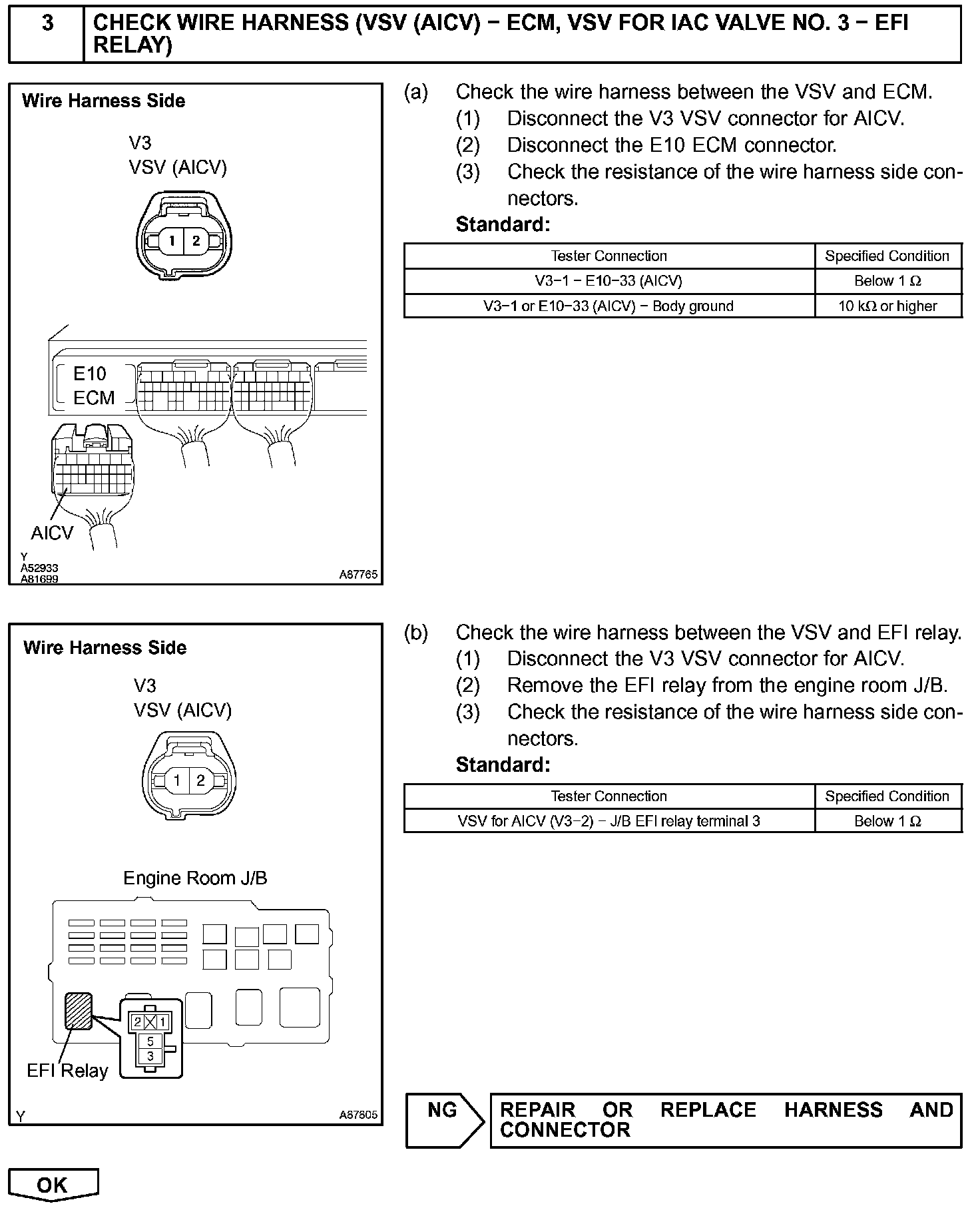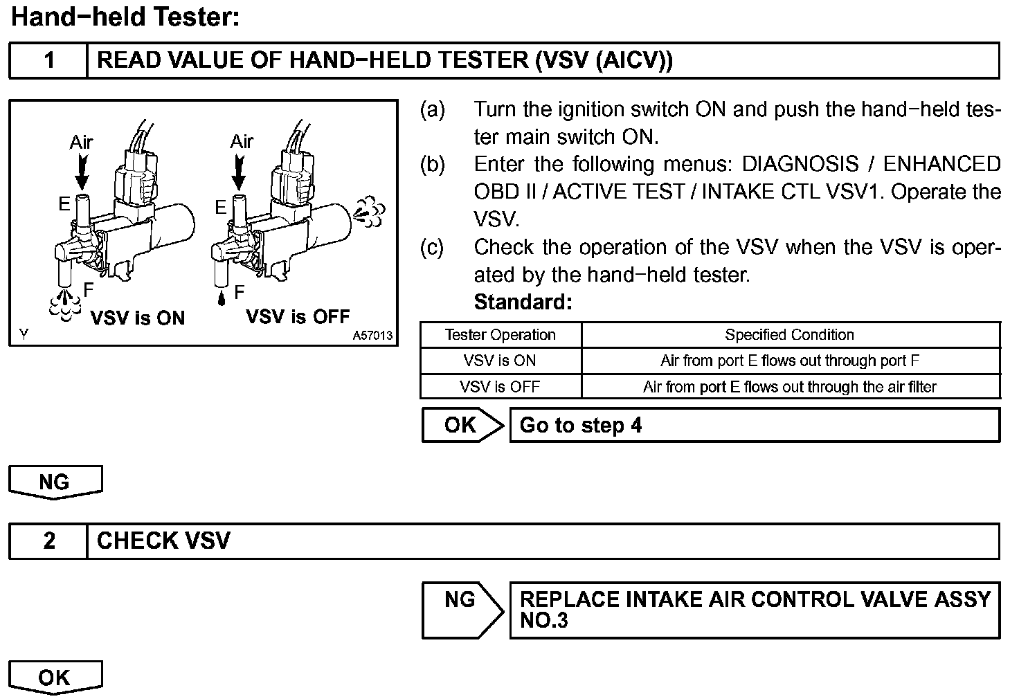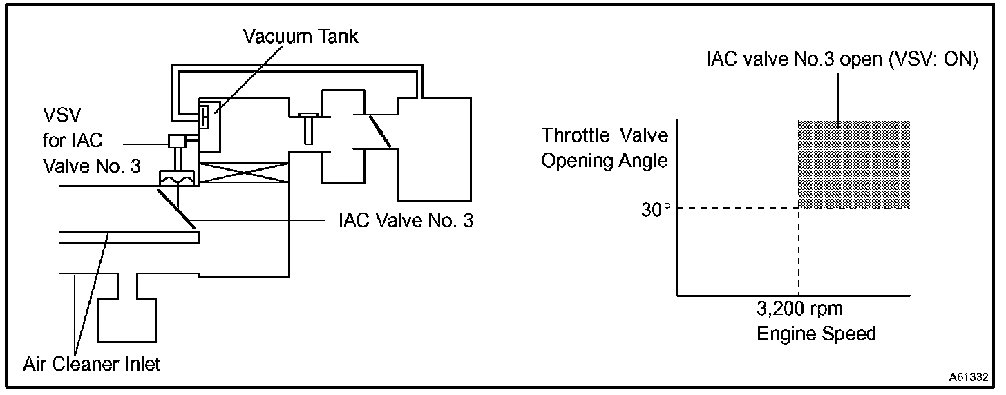 When the engine is operating at low to mid speeds, this system operates the IAC valve to close one of the air cleaner inlets. When the engine speed is more than 3,200 rpm and the opening angle of the throttle valve is more than 30 degrees, the ECM activates the VSV and opens the IAC valve No. 3.