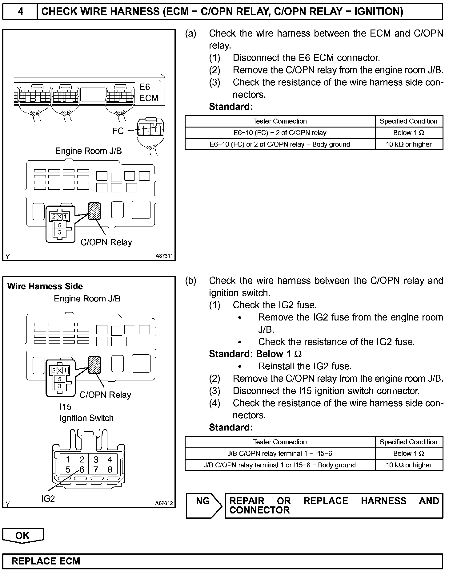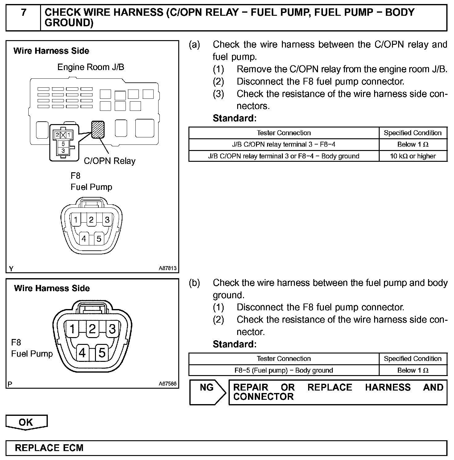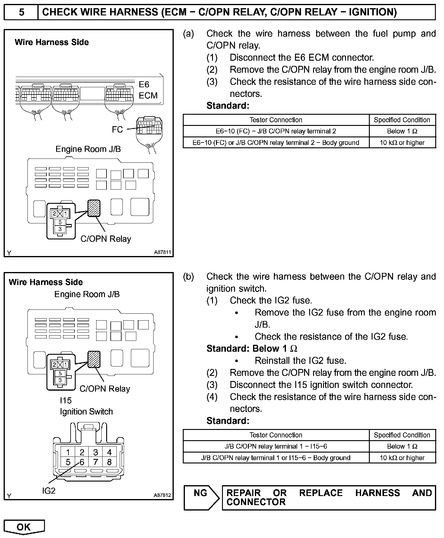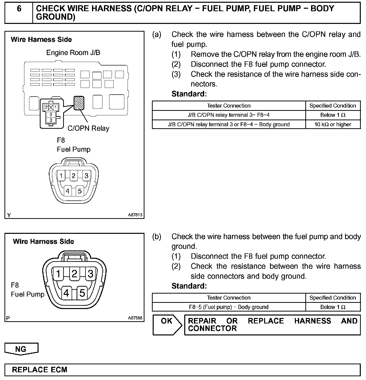 While the NE signal is generated and the engine is running, the ECM keeps Tr ON (C/OPN relay ON) and the fuel pump also keeps operating.