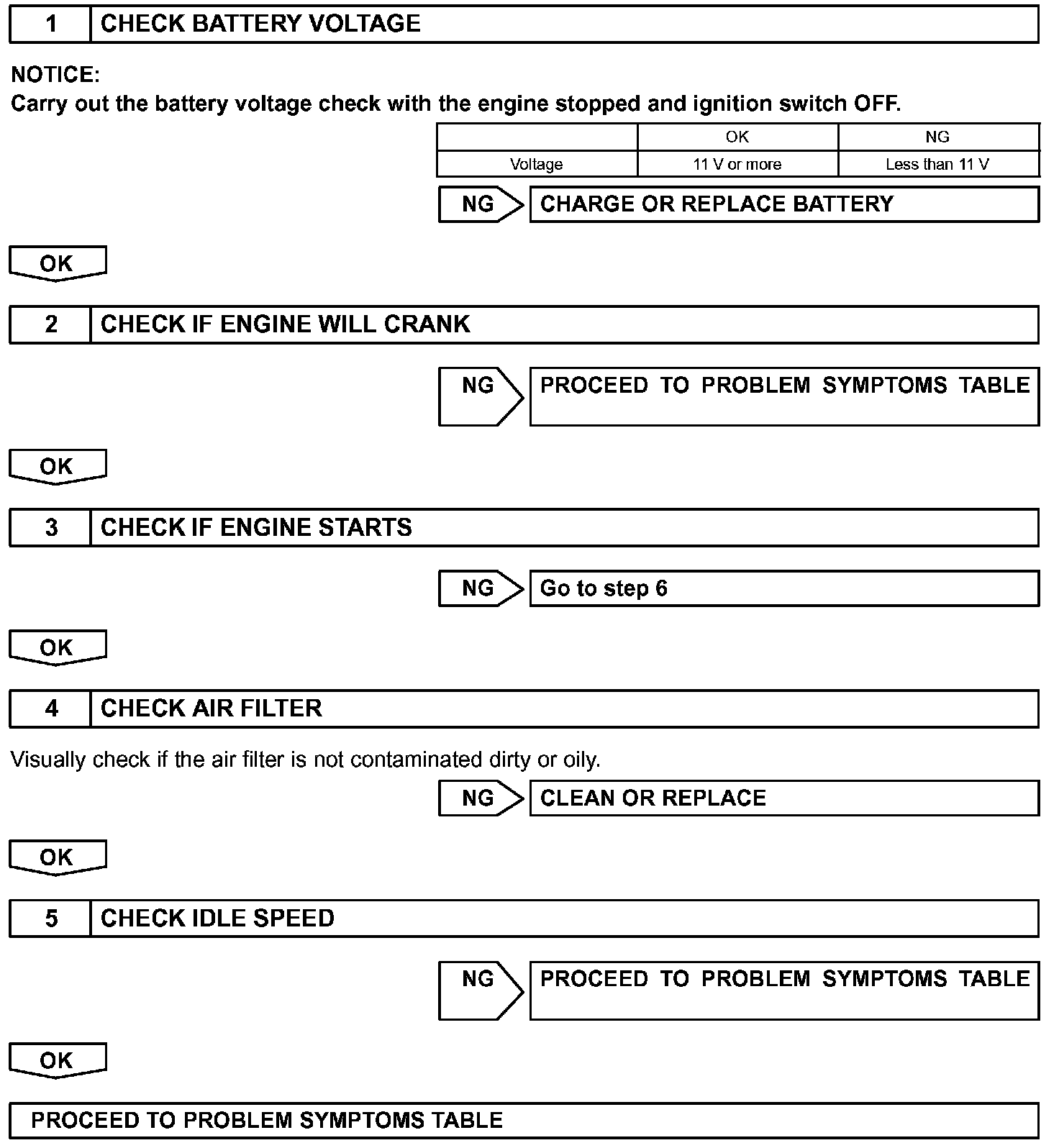 When the malfunction is not confirmed in the DTC check, troubleshooting should be carried out in all the possible circuits considered as possible causes of the problem. In many cases, by carrying out the basic engine check shown in the given flowchart, the problem can be found quickly and efficiently. Therefore, using this check is essential in the engine troubleshooting.
