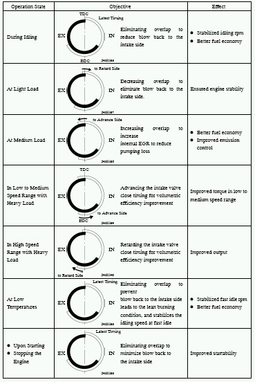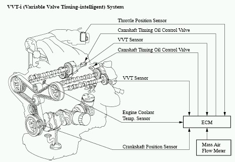 Using the engine speed, intake air volume, throttle position and engine coolant temperature, the ECM can calculate optimal valve timing for each driving condition and controls the camshaft timing oil control valve. In addition, the ECM uses signals from the camshaft position sensor and the crankshaft position sensor to detect the actual valve timing, thus providing feedback control to achieve the target valve timing.