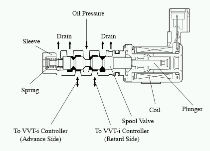 This camshaft timing oil control valve controls the spool valve position in accordance with the duty cycle control from the ECM. This allows hydraulic pressure to be applied to the VVT-i controller advance or retard side. When the engine is stopped the camshaft timing oil control valve is in the most retarde state.