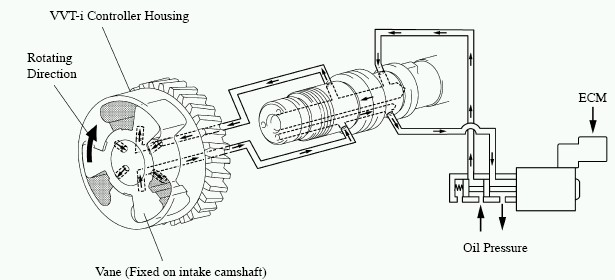This controller consists of the housing driving from the exhaust camshaft and the van coupled with the intake camshaft. The oil pressure sent from the advance or retard side path at the intake camshaft causes rotation in the VVT-i controller vane circumferential direction to vary the intake valve timing continuously. When the engine is stopped, the intake camshaft will be in the most retarded state to ensure startability. When hydraulic pressure is not applied to the VVT-i controller immediately after the engine has been started, the lock pin locks the movement of the VVT-i controller to prevent a knocking noise.