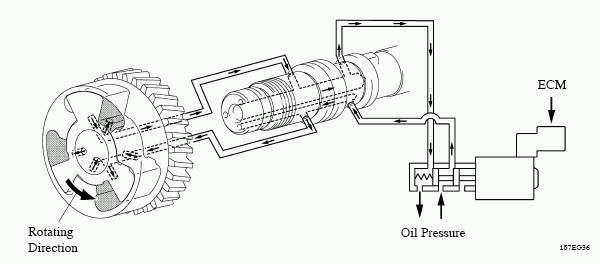 When the camshaft timing oil control valve is positioned as illustrated above by the advance signals from the ECM, the resultant oil pressure is applied to the vane chamber of advance side to rotate the camshaft in the timing advance direction.