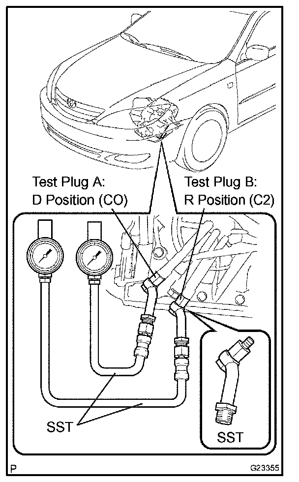 14. Remove the test plug B, install the SST and start engine.