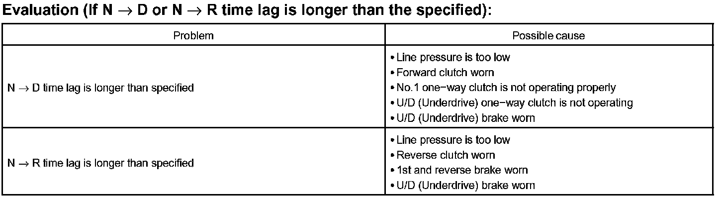 1. When the shift lever is shifted while the engine is idling, there will be a certain time lapse or lag before the shock can be felt. This is used for checking the condition of the direct clutch, forward clutch, and 1st and reverse brake.