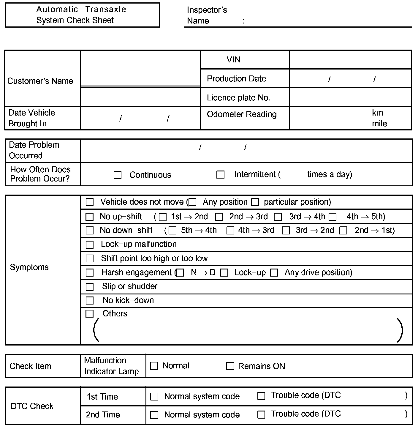 Automatic Transaxle System Check Sheet: