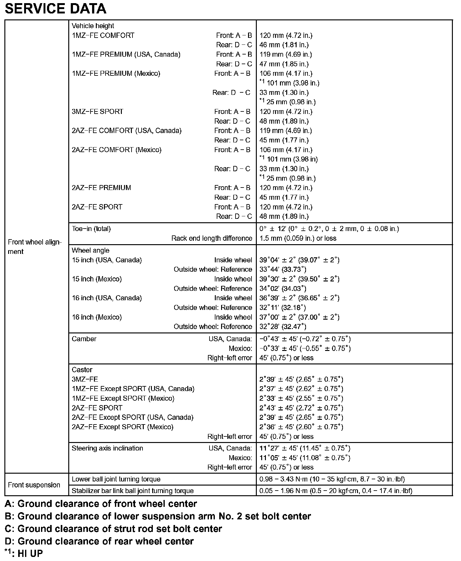 Front Suspension-Service Data: