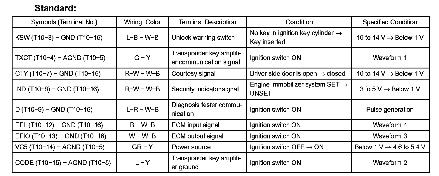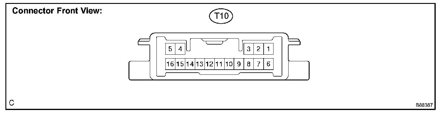 a. Disconnect the T10 ECU connector, and measure the voltage and resistance according to the value(s) in the table.