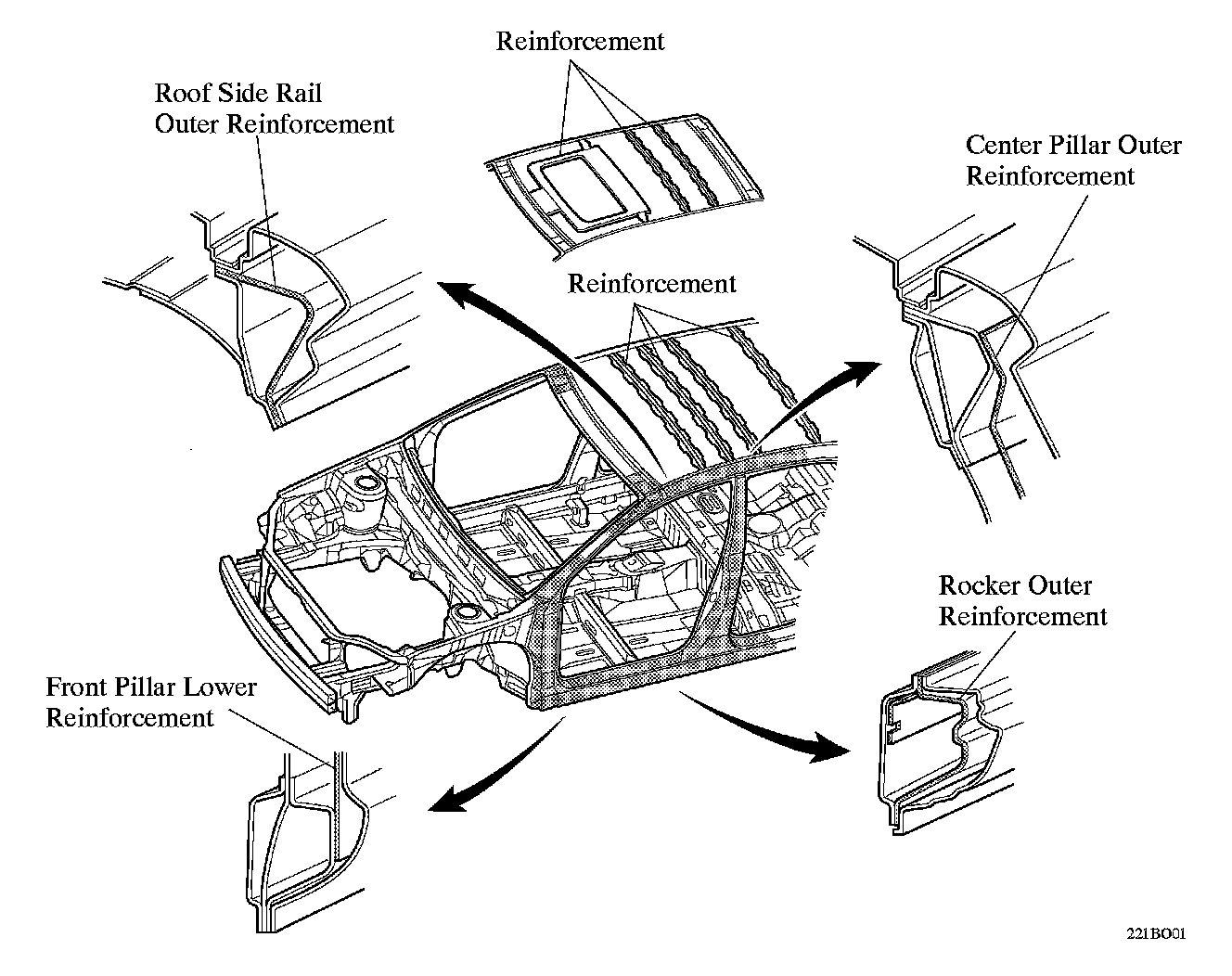 ^ Reinforcements have been efficiently place on the rockers, roof side rails, lower front pillars, and inside the center pillars to ensure proper body rigidity. As a result, road noise and vibration have been reduced and driving stability has been ensured.