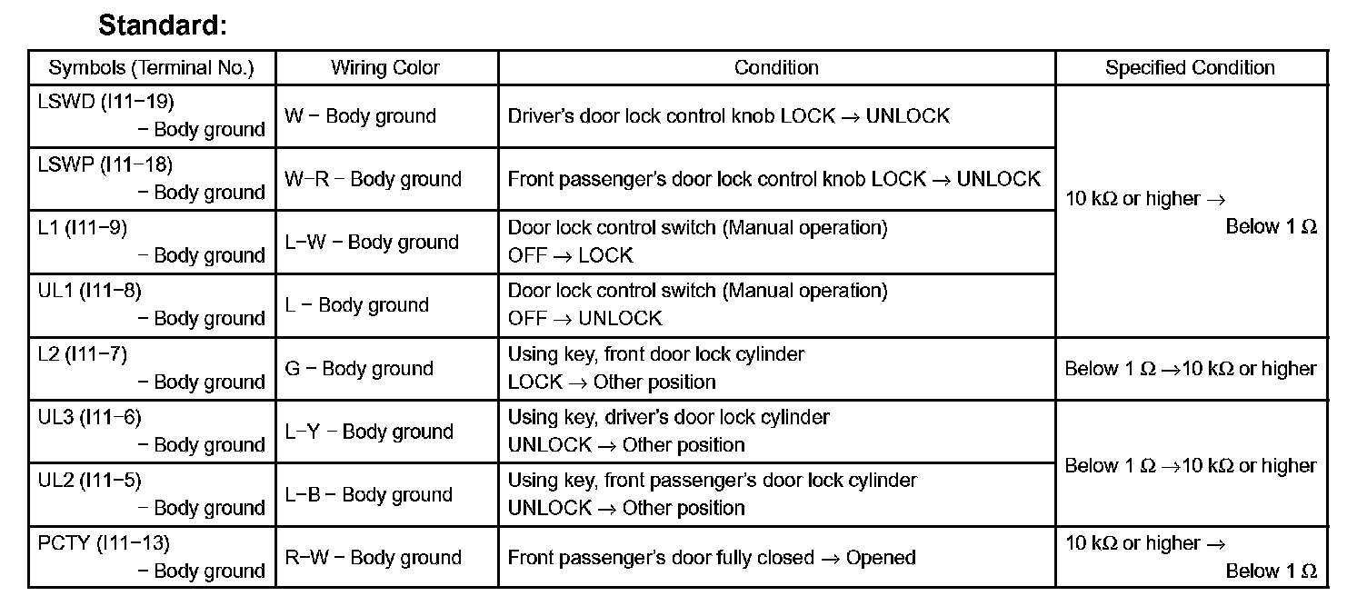 b. Measure the resistance between each terminal of the connector and the body ground, as shown in the illustration and table.