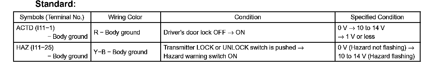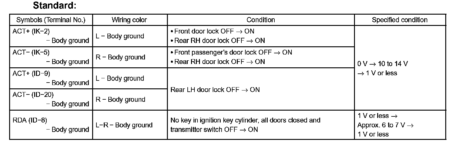 c. Reconnect the connectors and measure the voltage between each terminal and the body ground, as shown in the illustration and table.