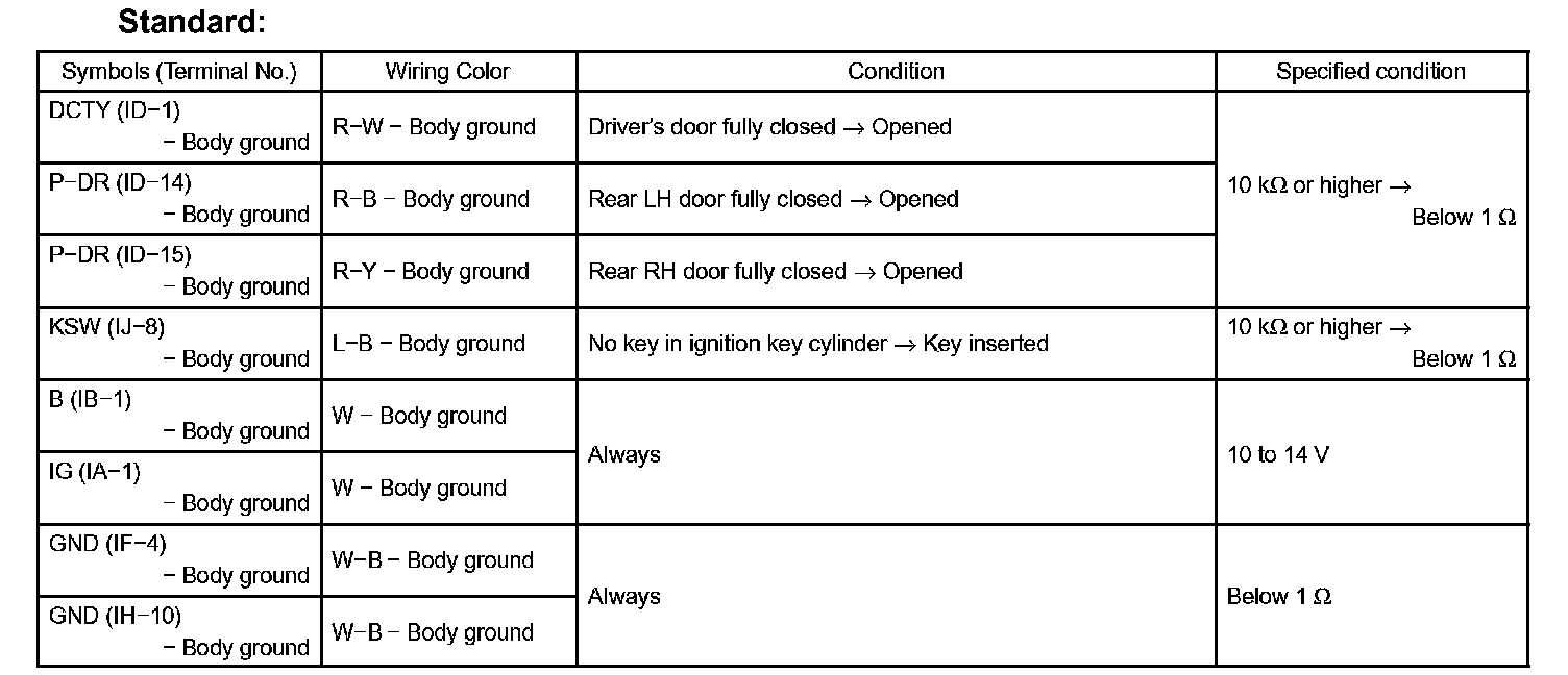 b. Measure the resistance and voltage between each terminal of the connectors and the body ground, as shown in the illustration and table.