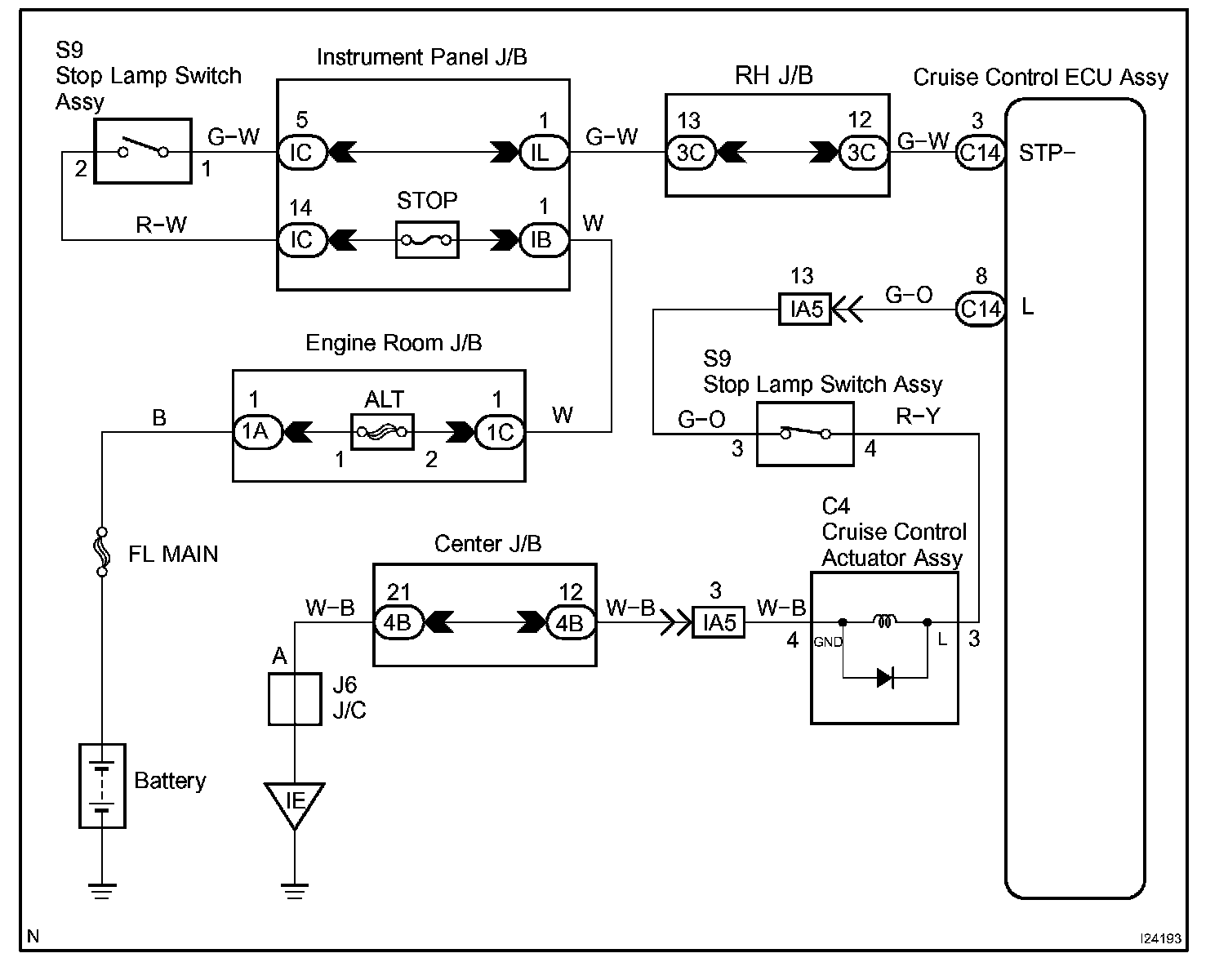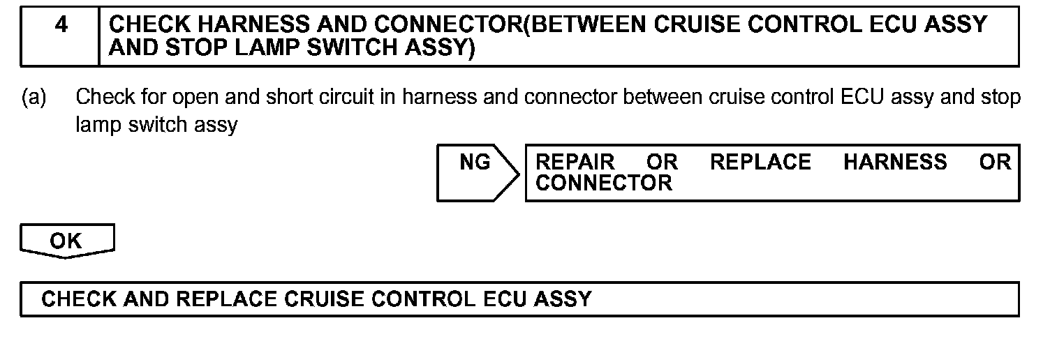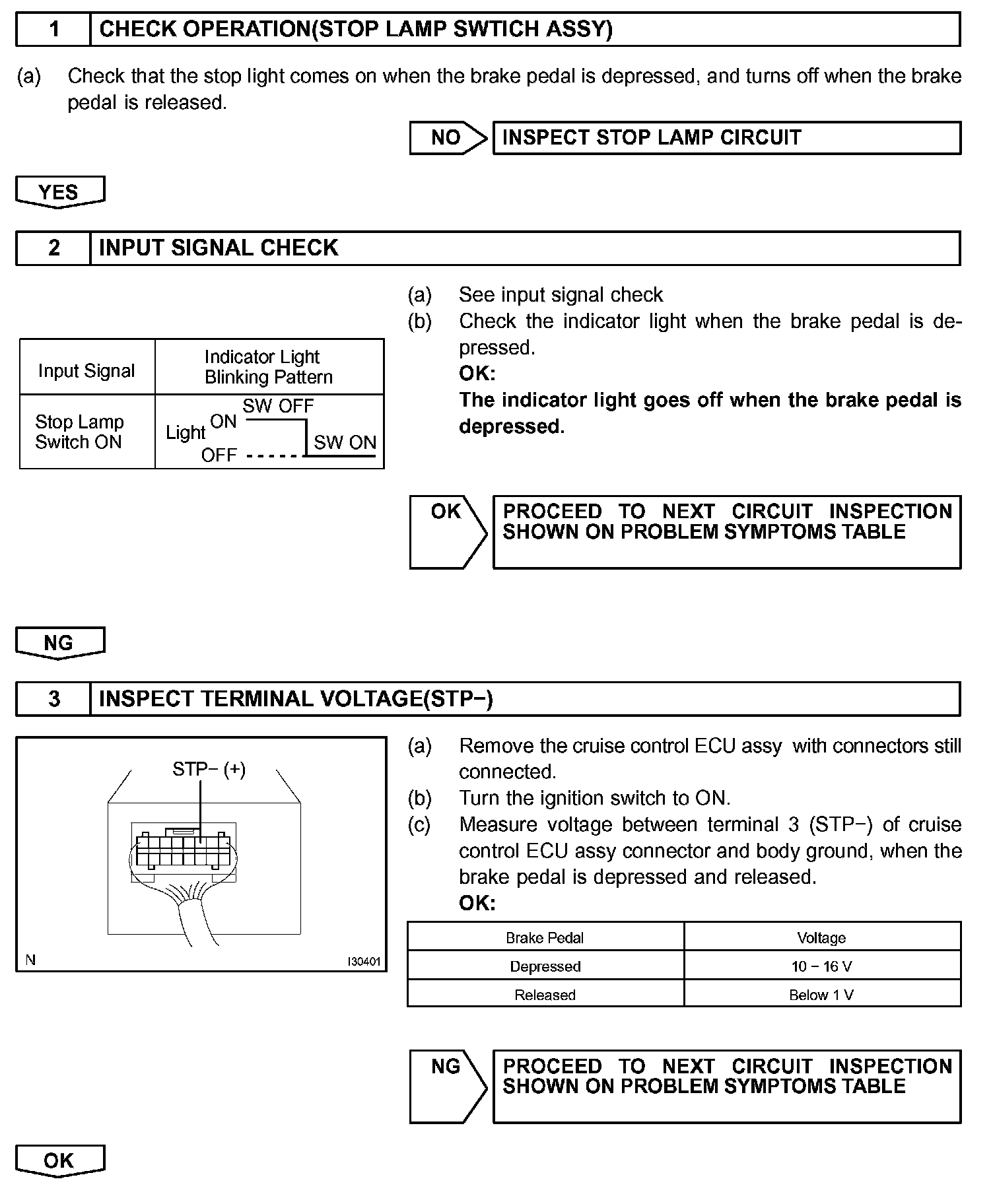 When the brake pedal is depressed, normal battery positive voltage normally is applied through the STOP fuse and stop lamp switch assy to terminal STP- of the cruise control ECU assy, and the cruise control ECU assy turns the cruise control to off.