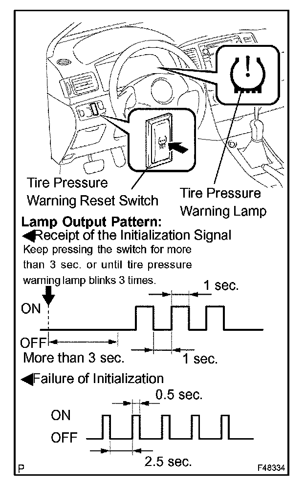 HINT: If the tire pressure warning lamp repeats a cycle of ON (0.5 sec.) and OFF (2.5 sec.) while the vehicle is being driven, initialization may have failed. If so, perform the initialization again. (Turn the ignition switch off and retry from step 1-a.)