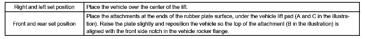 d. Set the vehicle on the lift as level as possible. Then match the groove of the lift to the rigid rack support location.