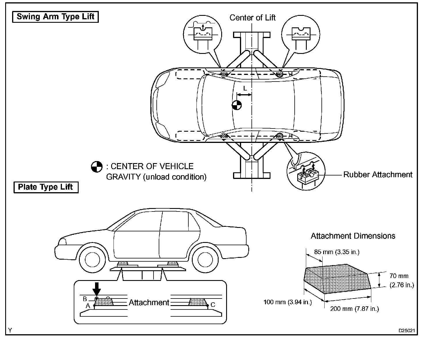 c. When using the lift, its center should be as close to the vehicle's center of gravity as possible (length of "L" should be as short as possible).