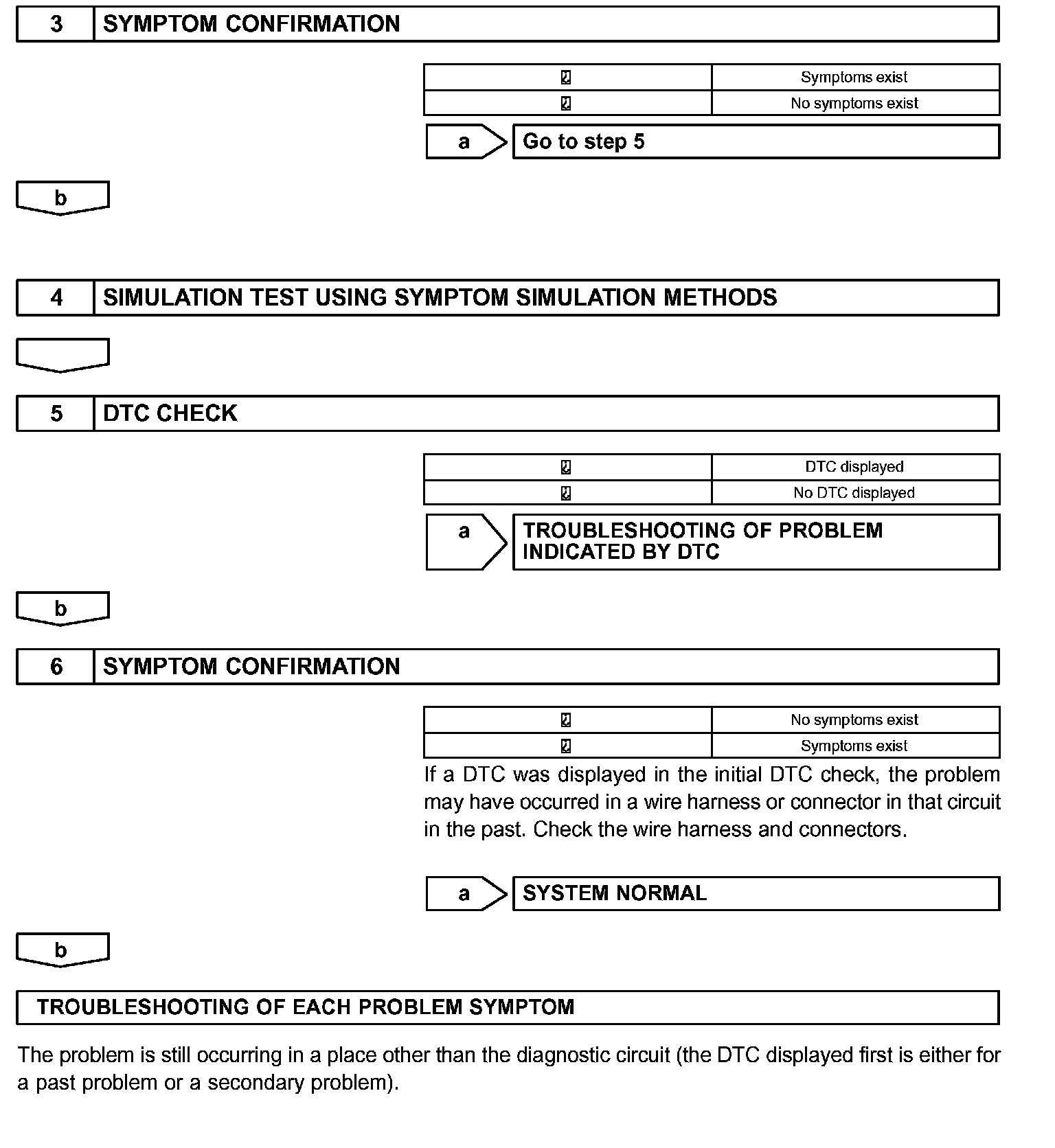 - In the DTC check, it is very important to determine whether the problem indicated by the DTC is: 1) still occurring, or 2) occurred in the past but has since returned to normal. In addition, the DTC should be compared to the problem symptom to see if they are related. For this reason, DTCs should be checked before and after confirmation of symptoms (i.e., whether or not problem symptoms exist) to determine current system conditions, as shown in the flowchart.