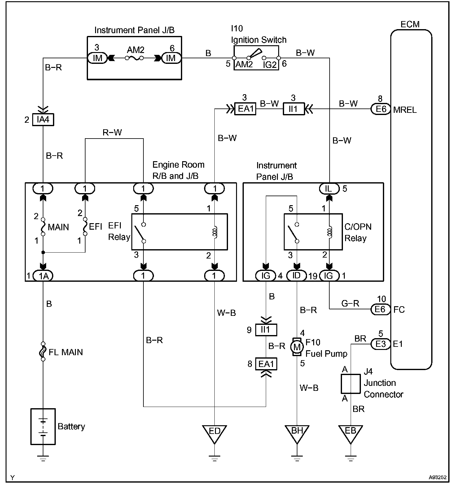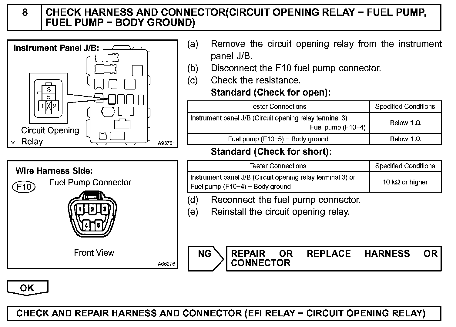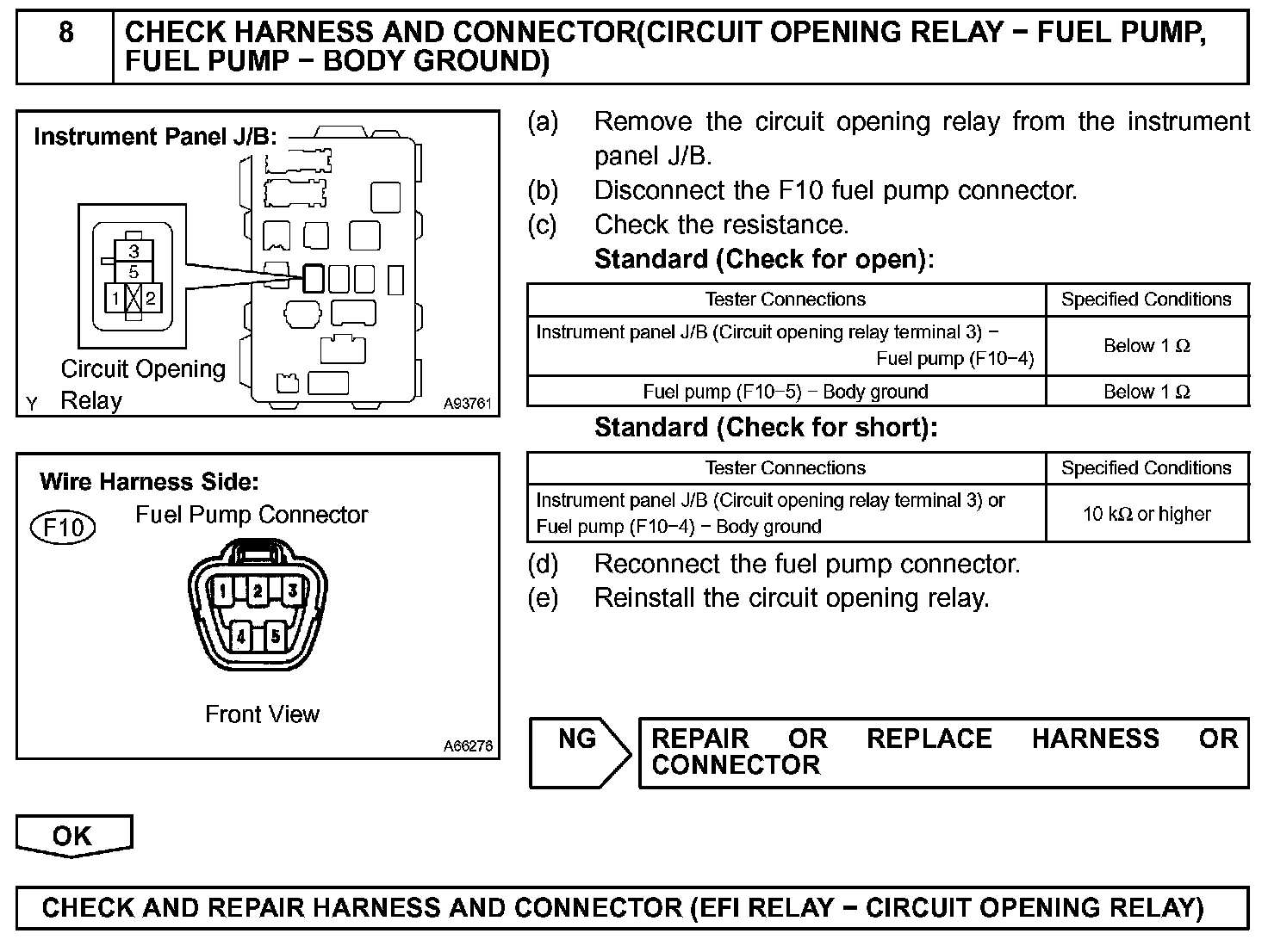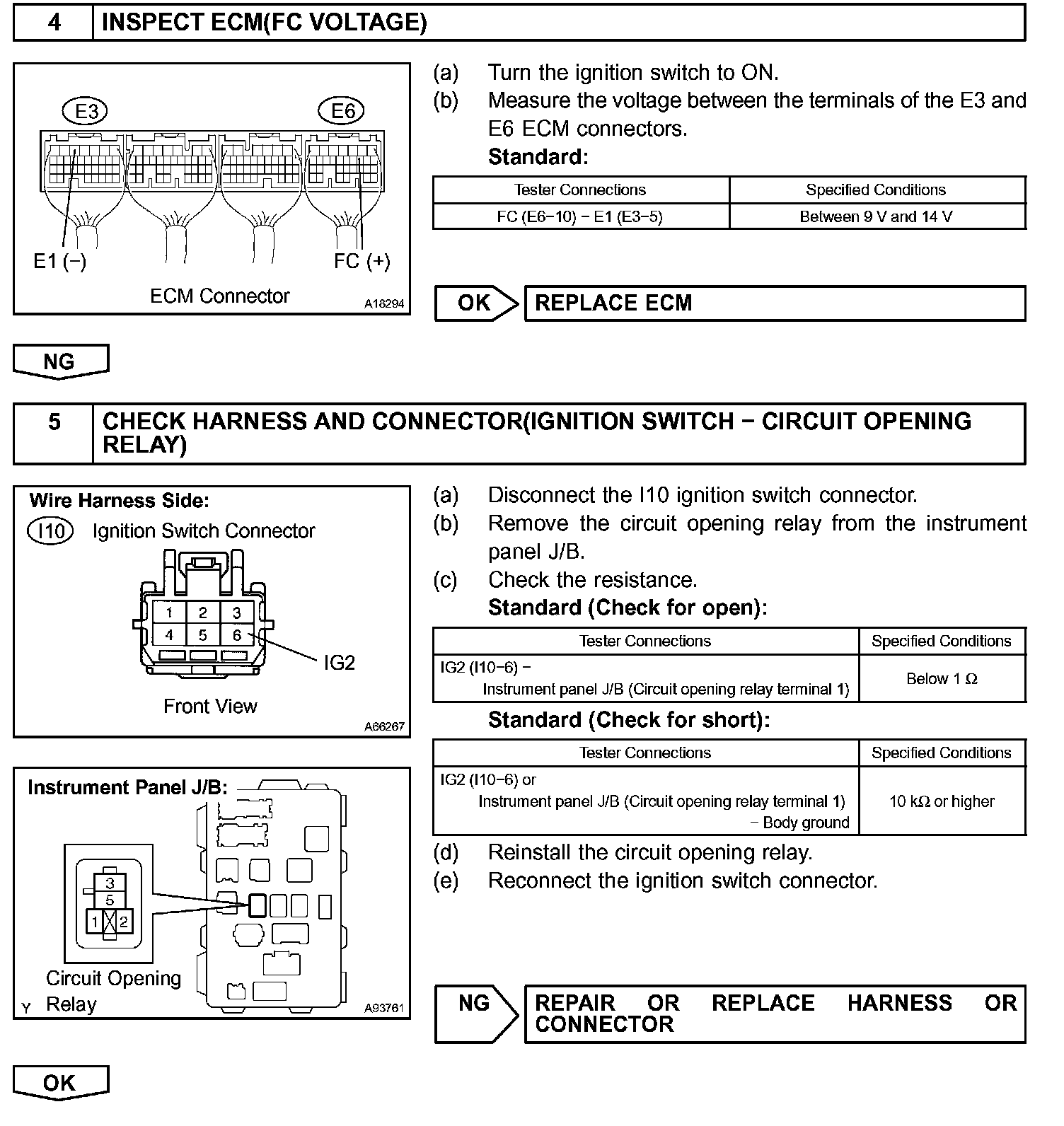 When the STA and NE signals are received by the ECM, Tr (power transistor) is switched on, allowing a current to flow into the circuit opening relay coil. The circuit opening relay switches on, power is supplied to the fuel pump and the fuel pump operates.