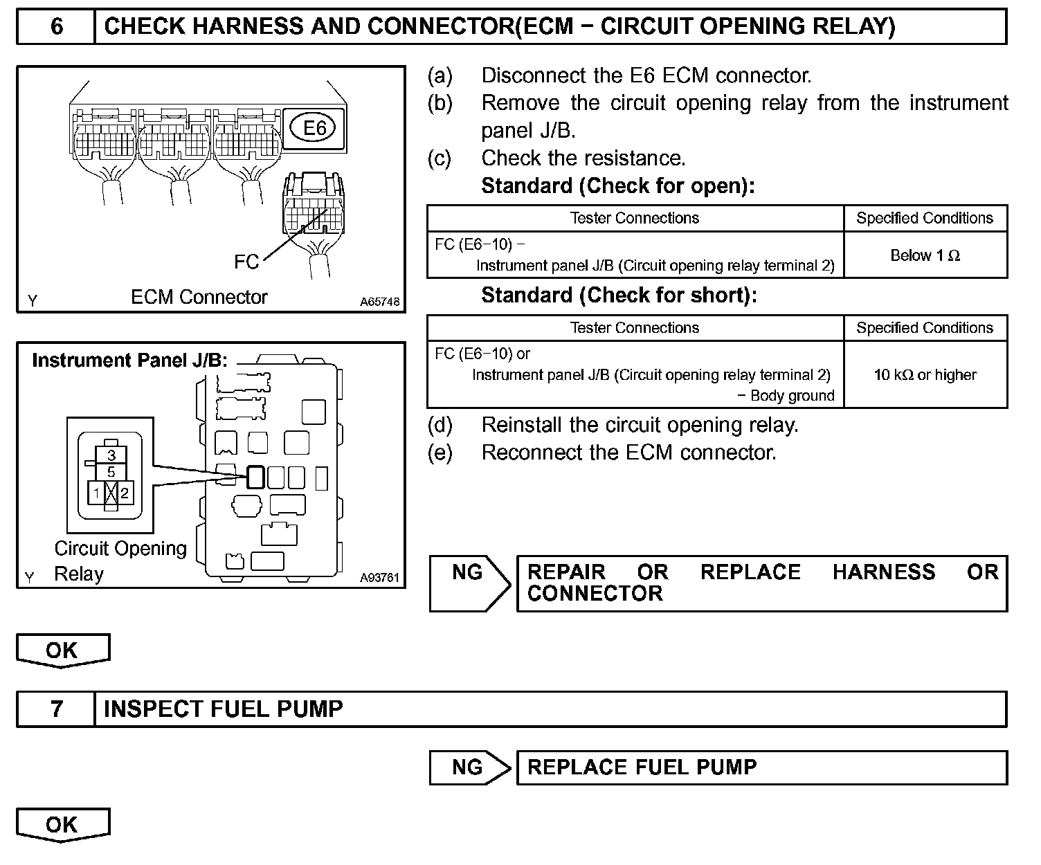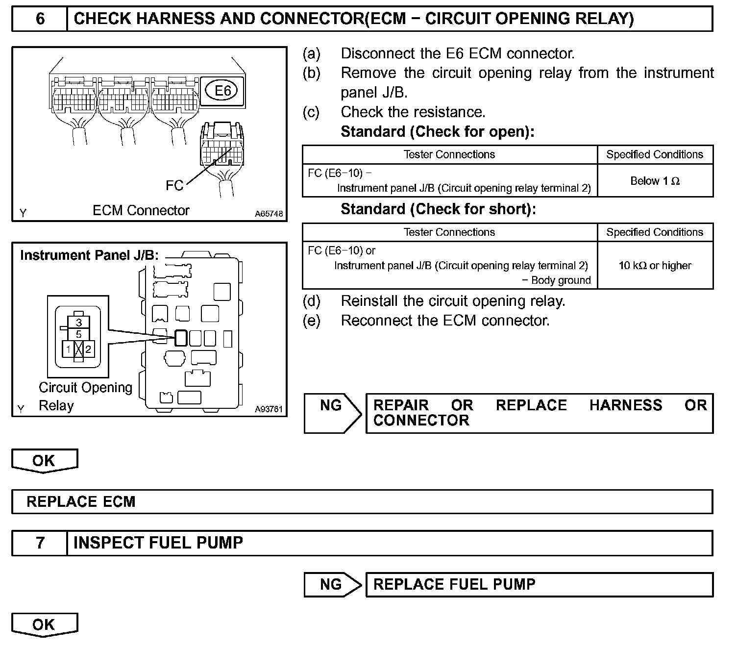 While the NE signal is being generated (engine running), the ECM keeps Tr ON, therefore keeping the circuit opening relay ON, so that the fuel pump continues to operate.