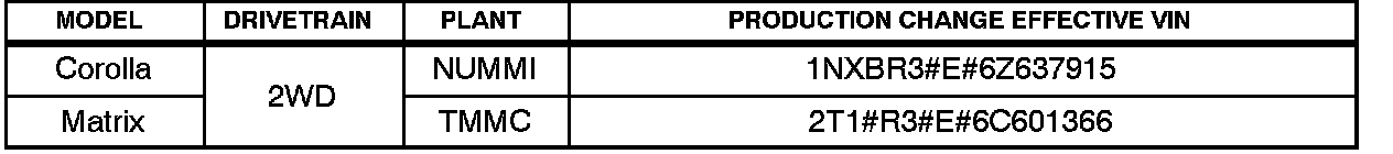 ^ 2005 - 2006 model year Corolla and Matrix vehicles equipped with 1ZZ-FE engine produced BEFORE the Production Change Effective VINs shown below.
