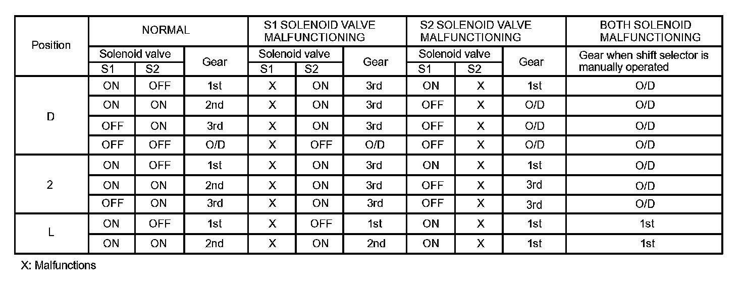 If either of the shift solenoid valve circuits develops an open or short, the ECM turns the other shift solenoid "ON" and "OFF" in order to shift into the gear positions shown in the table.