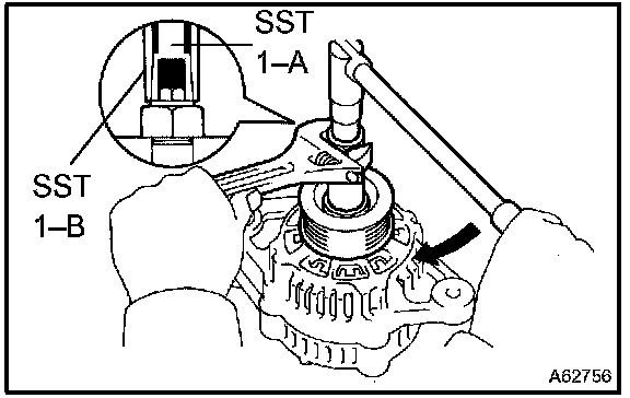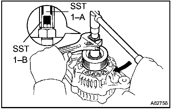 d. To loosen the pulley nut, turn SST 1-A in the direction shown in the illustration.