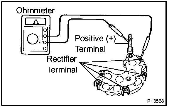 1. Using an ohmmeter, measure the resistance between the positive (+) terminal and each rectifier terminal.