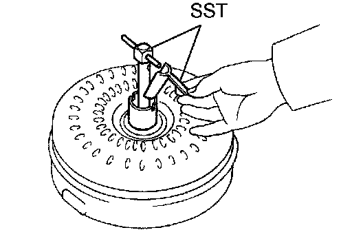 (3) Stand the torque converter up and turn the SST