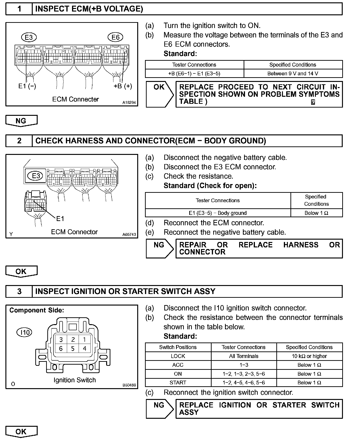 When the ignition switch is turned to ON, the battery voltage is applied to terminal IGSW of the ECM. The ECM MREL output signal causes a current to flow to the coil, closing the contacts of the EFI relay and supplying power to terminal +B of the ECM.