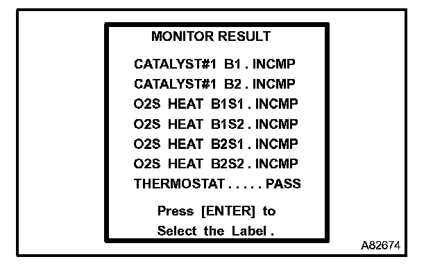 e. Select from the tester menus: DIAGNOSIS, ENHANCED OBD II, MONITOR INFO and MONITOR RESULT. The monitor status appears after the component name. INCMP: The component has not been monitored yet.