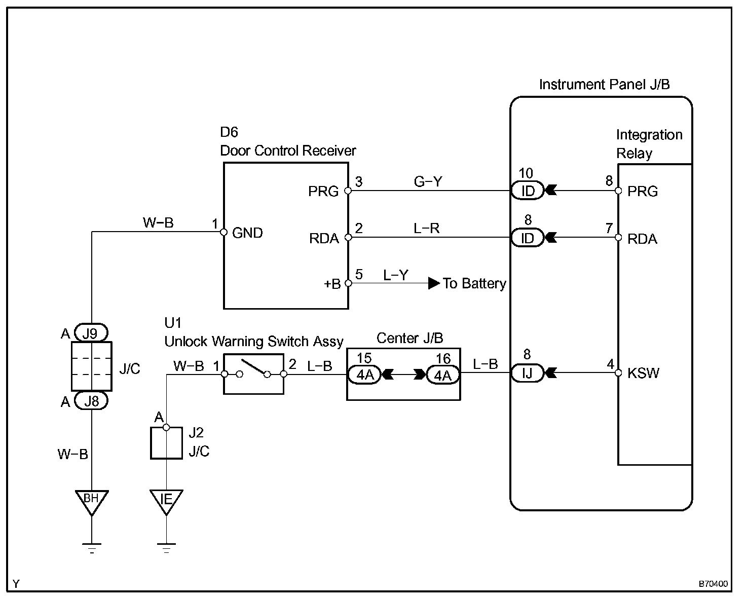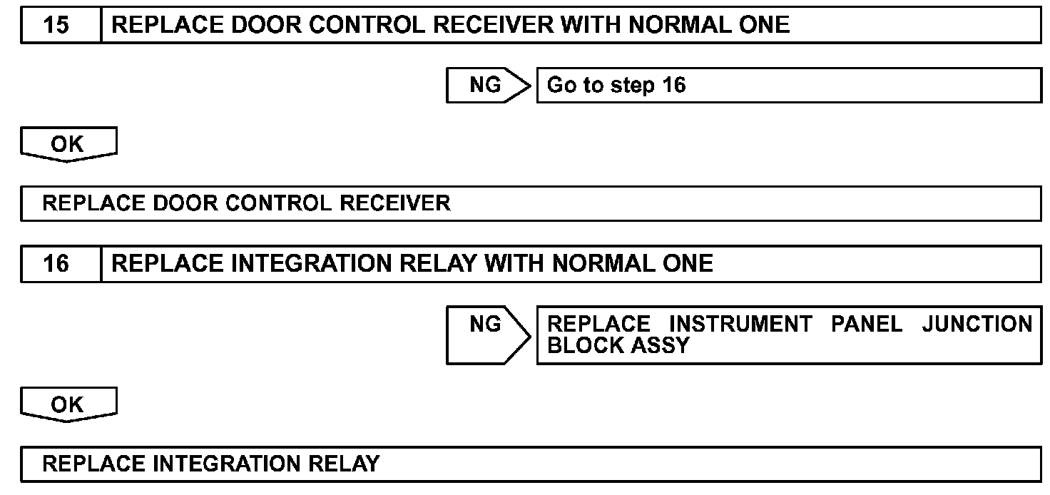 The door control receiver receives a signal from the transmitter and sends this signal to the integration relay. Then, the integration relay controls door operation by sending a door LOCK/UNLOCK signal to each door lock motor.